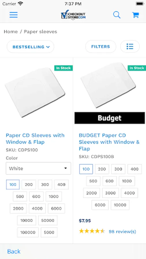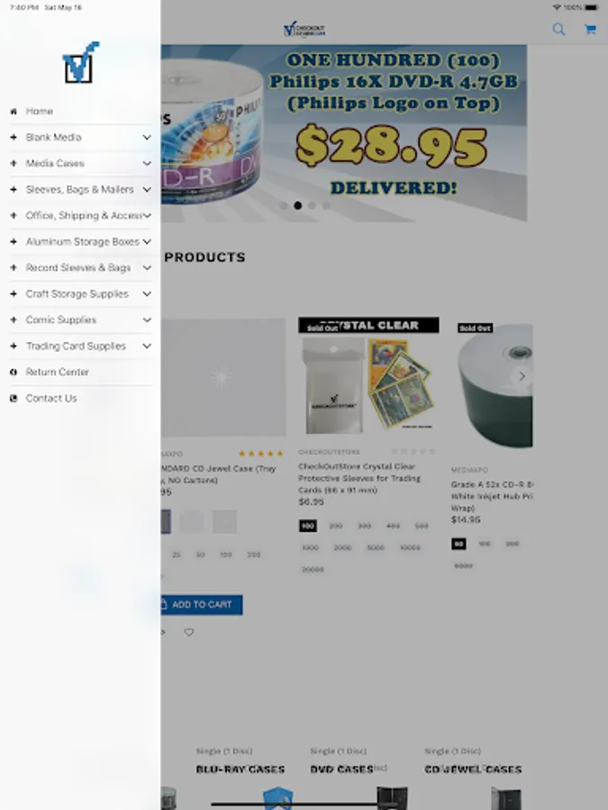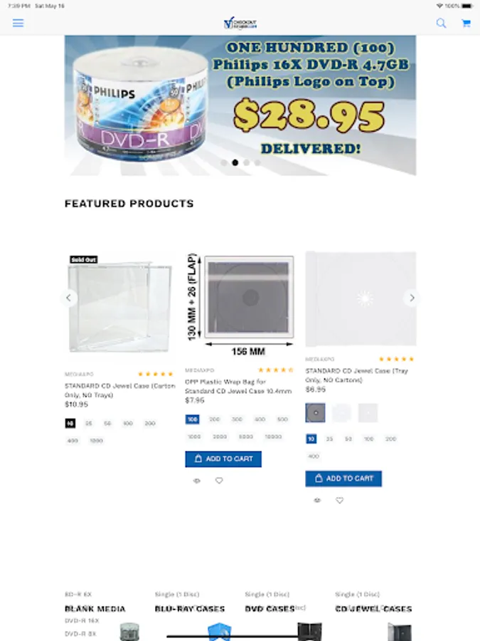 Welcome to the CheckOutStore App! We offer competitive prices on CDR, DVDR, Paper Sleeves, DVD Cases, Jewel Cases, Media Supplies and Accessories.