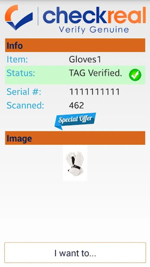 To use CheckReal, simply point the app towards a CheckReal tag found on selected products. the App will verify that the item is Genuine, including displaying what the item should look like and other product features.