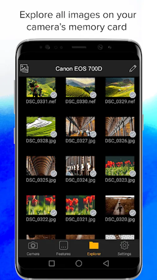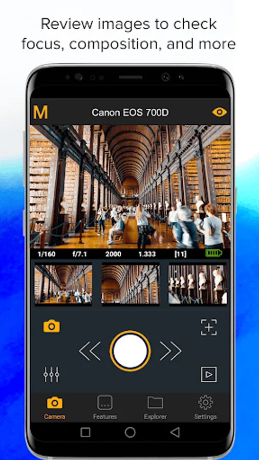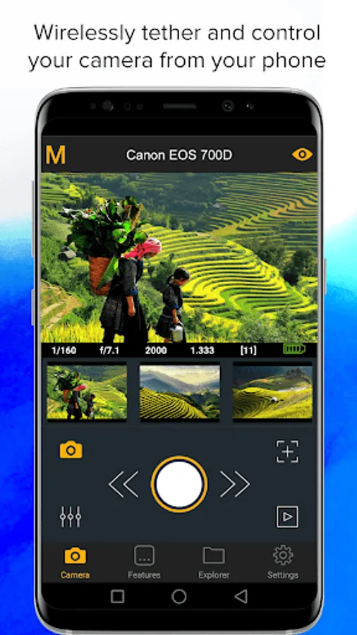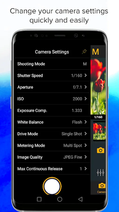 Control many of the camera functions and settings from your Android device including live view, creative modes, auto-focus, aperture, shutter, ISO and more. Also, Air Remote adds features which may not be available in-camera like focus-peaking and touch focus.