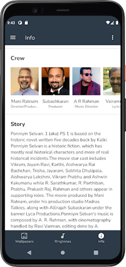 Ponnaiyan Selvan: I (transl. Son of Ponni) is an Indian Tamil-language period action drama film directed by Mani Ratnam, who co-wrote it with Elango Kumaravel and B. Jeyamohan. Produced by Ratnam and Subaskaran Alli rajah under Madras Talkies and Lyca Productions, it is the first of two cinematic parts based on Kalki Krishnamurthy's novel Ponnaiyan Selvan. The film stars an ensemble cast of Vikram, Aishwarya Rai Bachchan, Jayam Ravi, Karthi, Trisha, Aishwarya Lekshmi, Sobhita Dhulipala, Prabhu, R. Sarathkumar, Vikram Prabhu, Jayaram, Prakash Raj, Rahman and R. Parthiban. The music is composed by A. R. Rahman, with cinematography handled by Ravi Varman, editing done by A. Sreekar Prasad and production design by Thota Tharani. Ponnaiyan Selvan: I tells the story of the early life of Arulmozhivarman, who would become the Chola emperor Rajaraja
