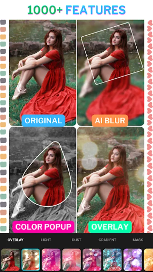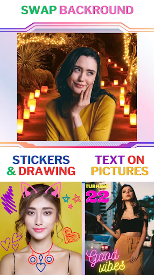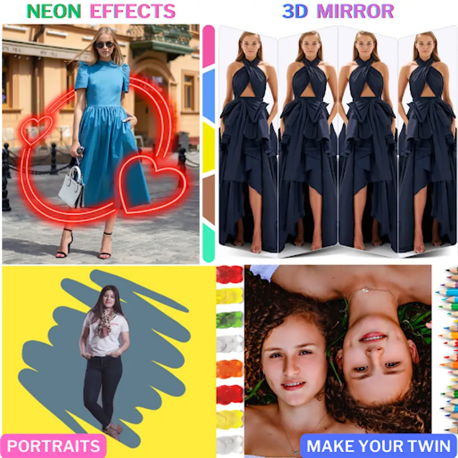 ➧Effects: Apply Drip, Neon, Mirror, Wings, Overlay, Splash & Blur effects. ➧Cutout and change background by following the new trends.