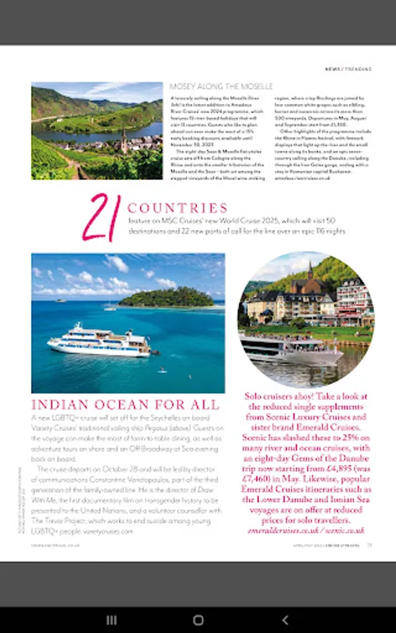 Cruise & Travel is the UK’s highest-selling cruise magazine, packed with advice and inspiration celebrating the best of cruise holidays. Each issue brings together expert-written reviews, travel features and in-depth destination guides, along with celebrity interviews, eye-catching photography and insider tips to help you plan your next escape. Whether you’re a cruise aficionado or it’s your first time at sea, Cruise & Travel is your must-read guide to ocean, river, small-ship and expedition voyages to every corner of the world.