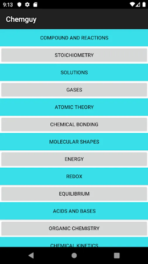 The Chemguy App, that I have personally built, has distilled my teaching career into a course that completely covers high school chemistry, AP and IB material, and first year university chemistry. Everything is covered: The Periodic Table, Compounds and Reactions, Stoichiometry, Solutions, Gases, Atomic Theory, Chemical Bonding, Molecular Shapes, Energy, Electrochemistry, Chemical Equilibrium, Acids and Bases, Organic Chemistry, Chemical Kinetics, Thermodynamics, and Calculating Uncertainty Values. Phew!