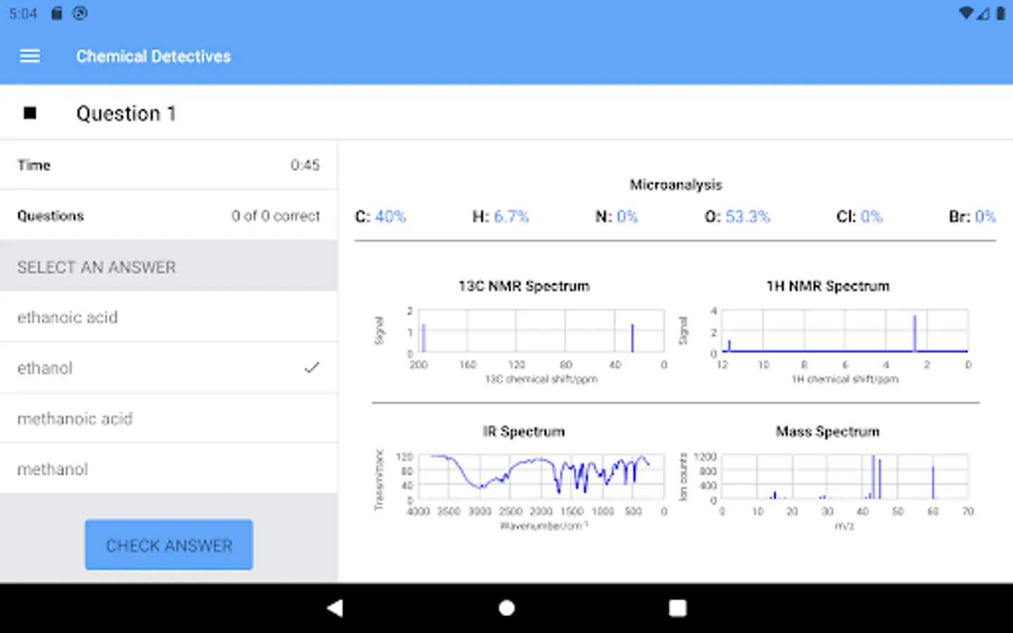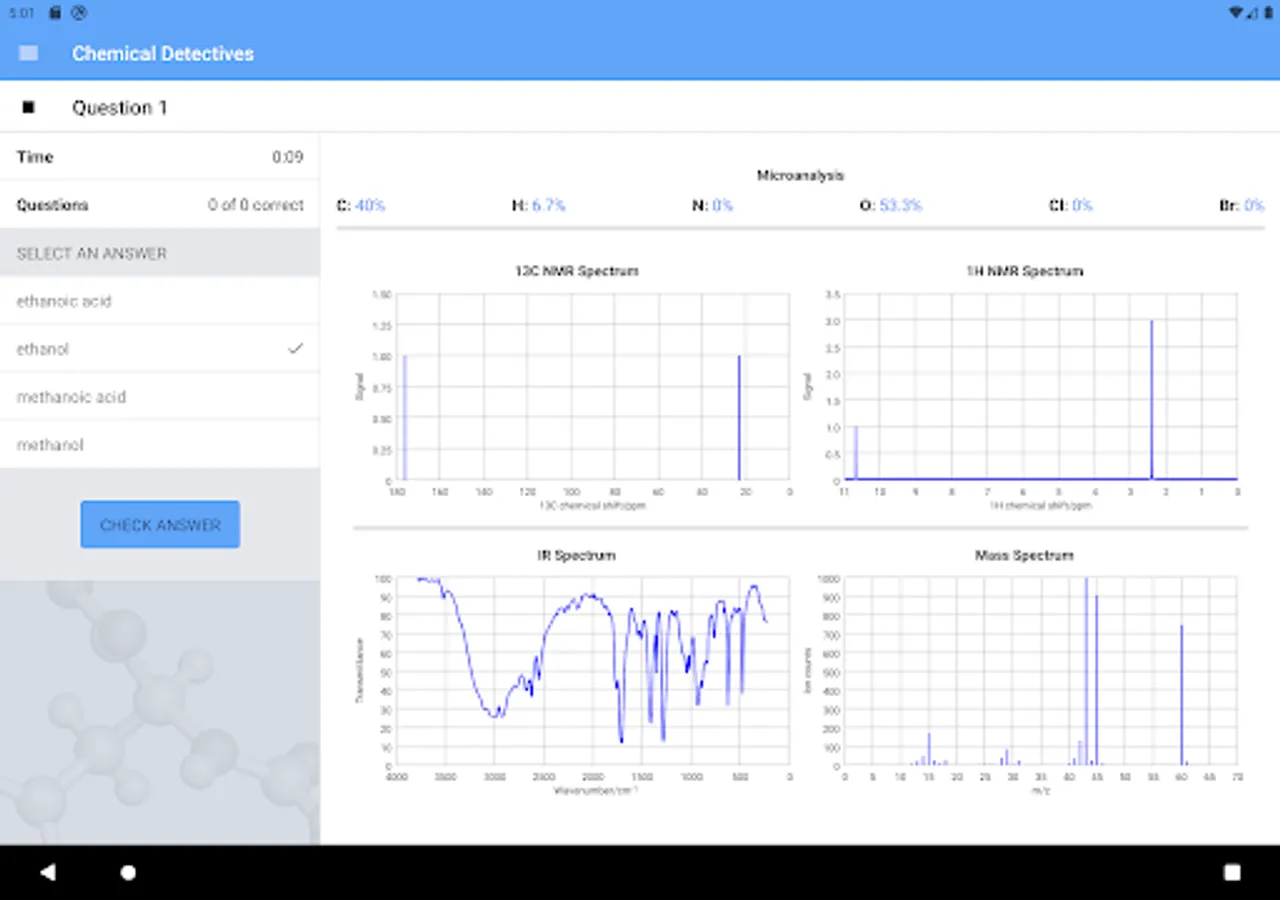 This app allows you to be a 'chemical detective' and take all of the available clues for different molecules and solve their molecular structure! One by one, each spectrum reveals information about a molecule, such as the size, the functional groups, and the number of each kind of atom, which can then be pieced together.