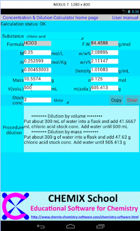 CHEMIX School concentration calculator and dilution calculator offer an easy and intuitive way of calculating and convert between different unit concentrations. It allow dilution calculations using a stock solution. It can convert/calculate the weight of a substance to mol and vice versa.