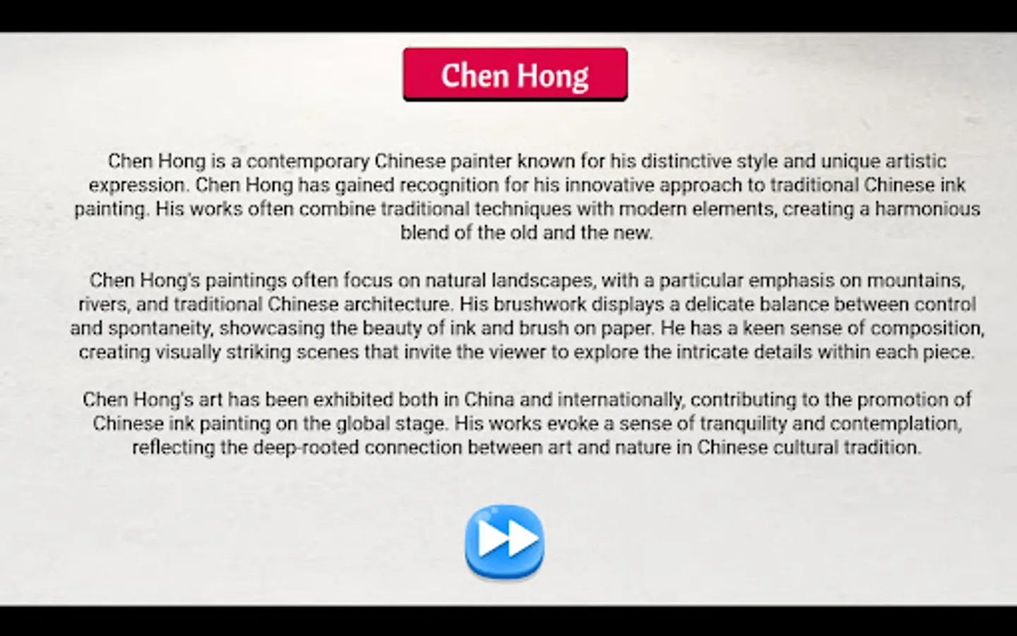 Chen Hong is a contemporary Chinese painter known for his distinctive style and unique artistic expression. Chen Hong has gained recognition for his innovative approach to traditional Chinese ink painting. His works often combine traditional techniques with modern elements, creating a harmonious blend of the old and the new.