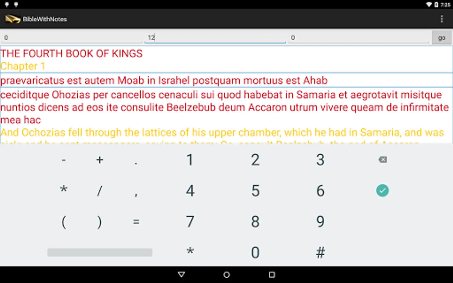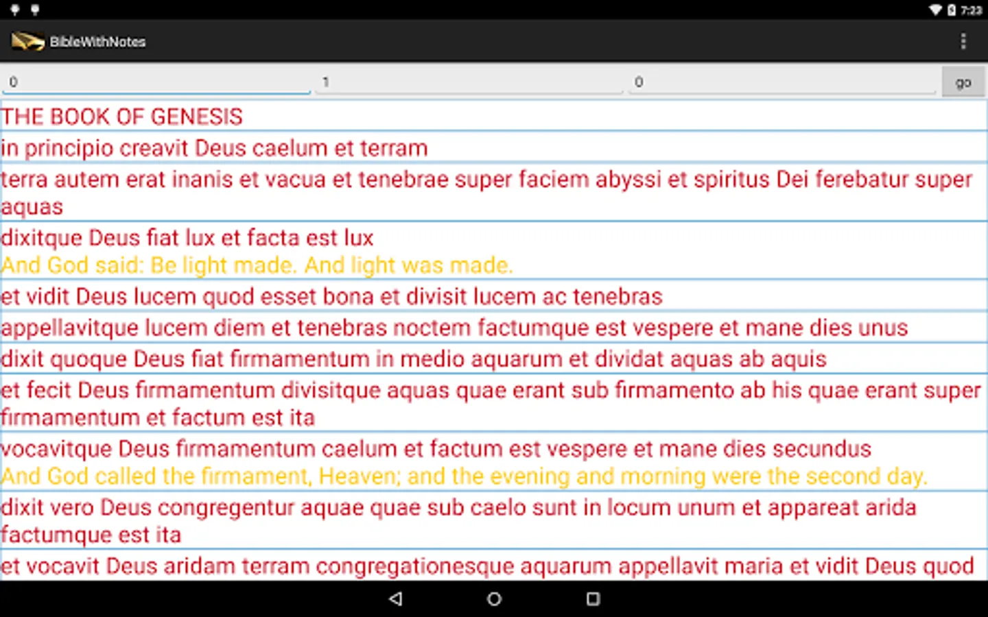 A simple program with latin and English translation. The three number is text, book, and chapter. Press Go to see the content.
