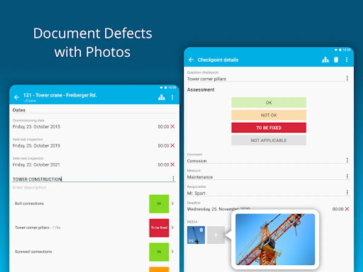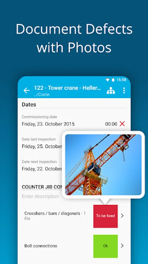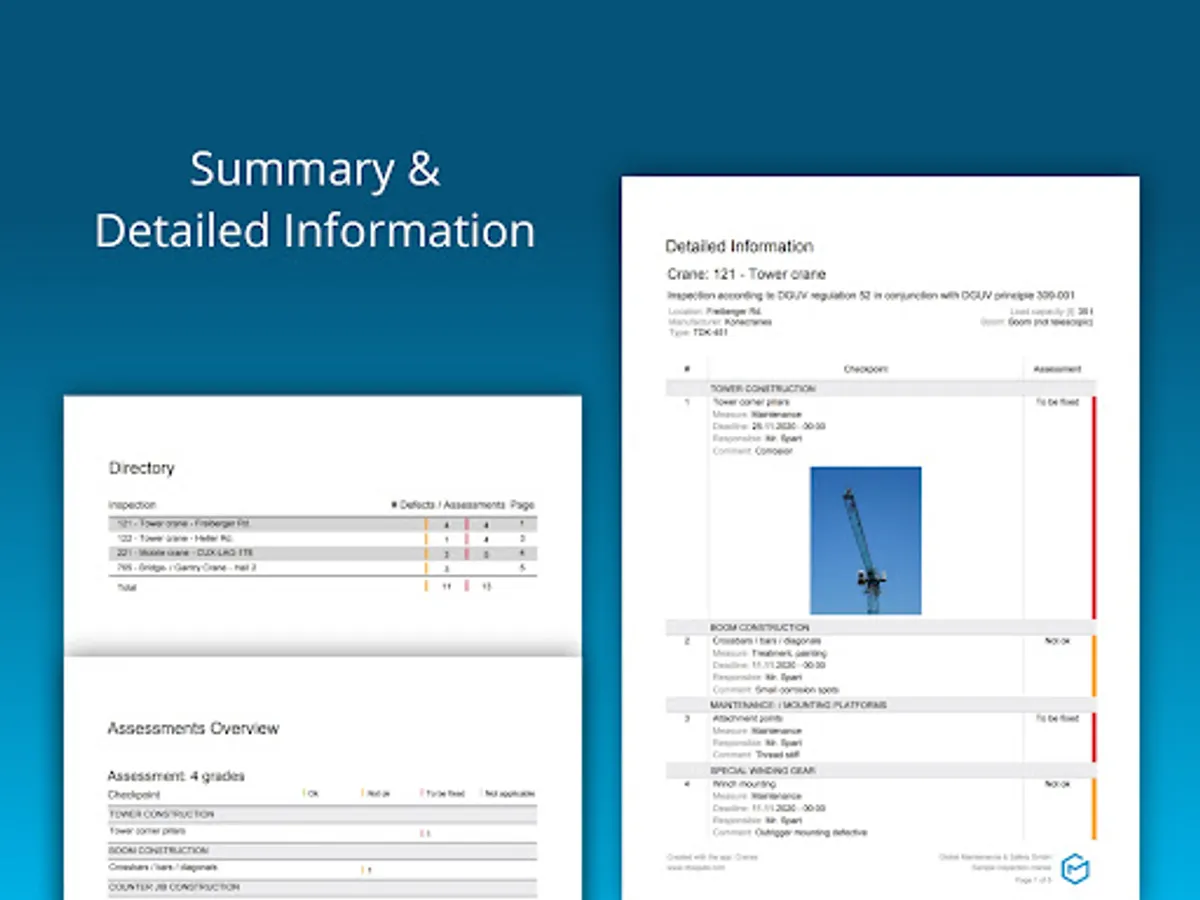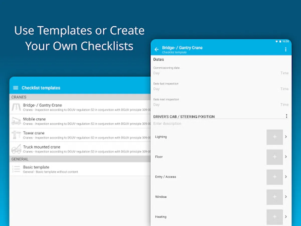 This is the CHEQSITE app for inspecting cranes in accordance with DGUV, OSH & HSE PUWER regulations. Includes among others DGUV Regulation 52, DGUV principle 309-001.