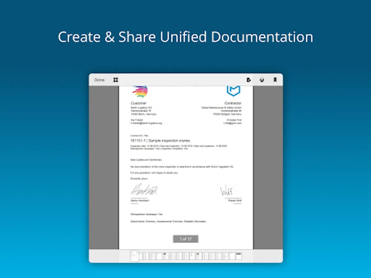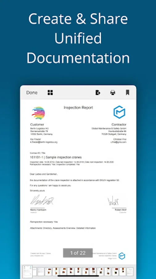 At the end of the process, you create uniform reports and easily share them with your customers and partners, e.g. via cloud services or email. The inspection report contains a management summary of the inspected objects / sites as well as a detailed list of defects and hazards including photos and information, such as required actions and responsibilities.