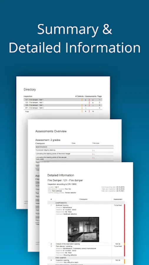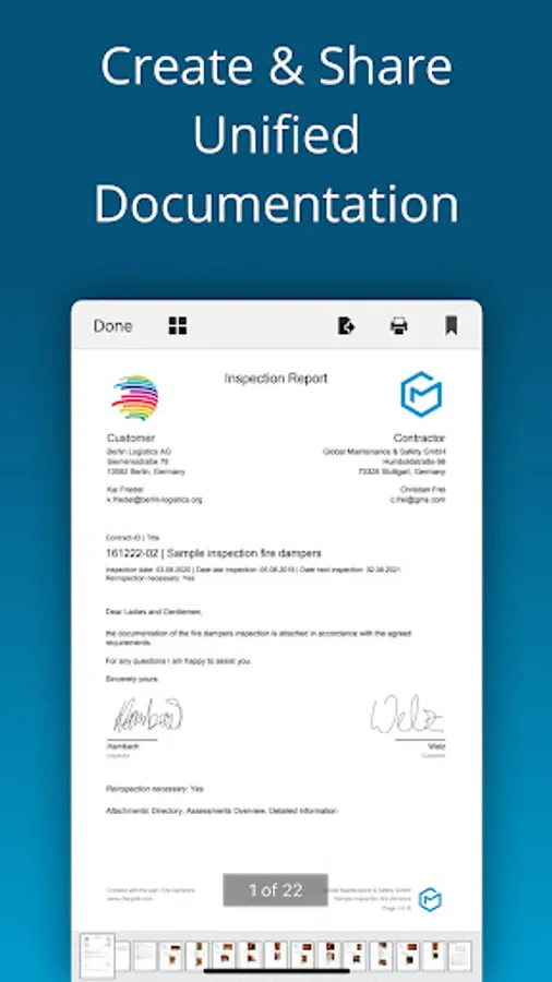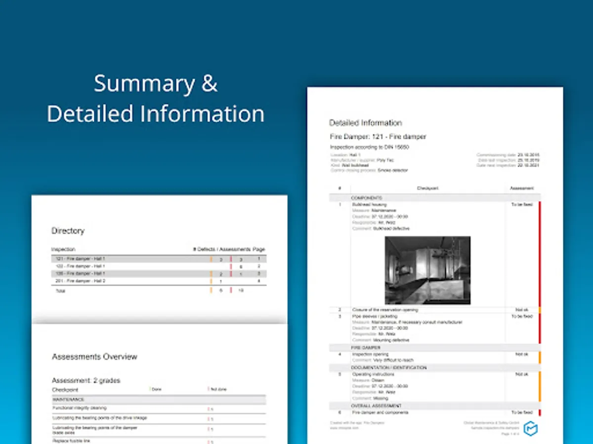 At the end of the process, you create uniform reports and easily share them with your customers and partners, e.g. via cloud services or email. The inspection report contains a management summary of the inspected objects / sites as well as a detailed list of defects and hazards including photos and information, such as required actions and responsibilities.