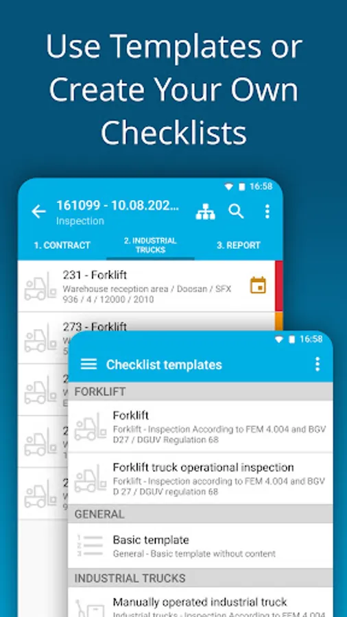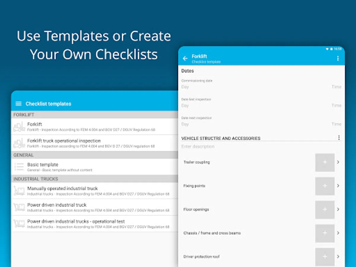 Included templates / checklists: Forklift truck, forklift truck operational test, hand driven industrial truck, power driven industrial truck, power driven industrial truck operational test