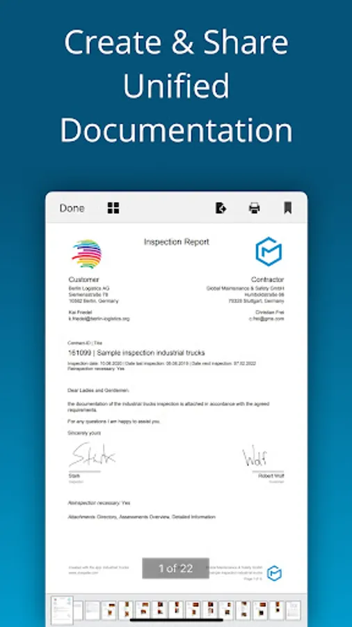 At the end of the process, you create uniform reports and easily share them with your customers and partners, e.g. via cloud services or email. The inspection report contains a management summary of the inspected objects / sites as well as a detailed list of defects and hazards including photos and information, such as required actions and responsibilities.