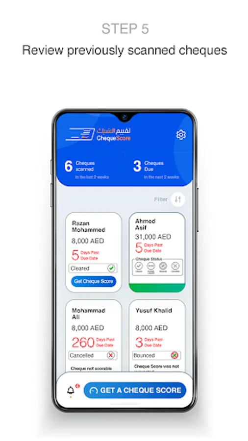 You will instantly get a Cheque Score displayed on your screen. On our app you can keep track of all your scanned and issued cheques in one place, you can also send reminders to notify the issuer when the cheque is due and you can share the Cheque Score with others if you wish.