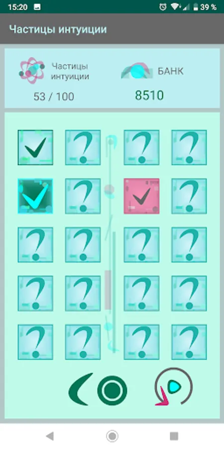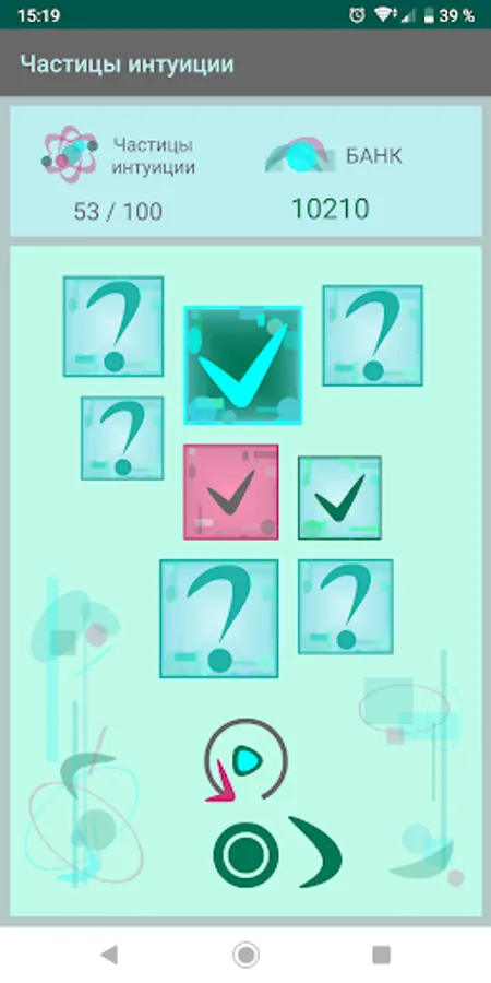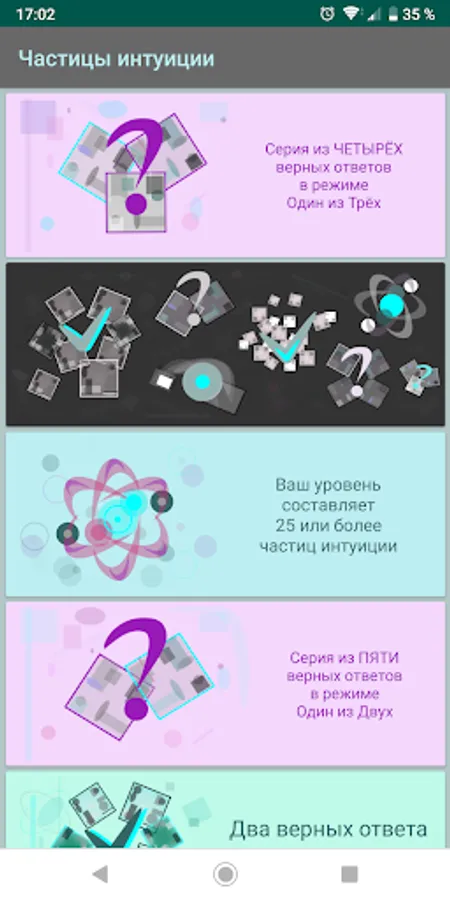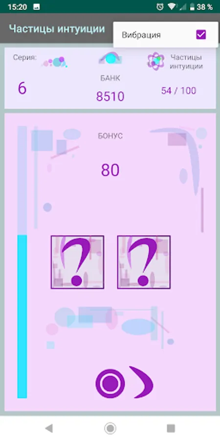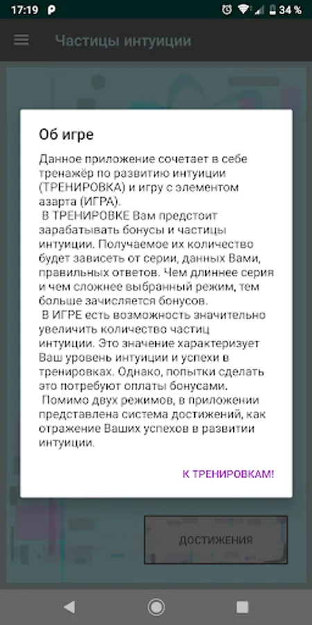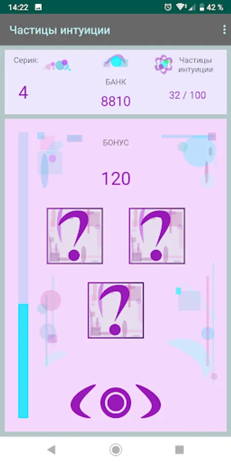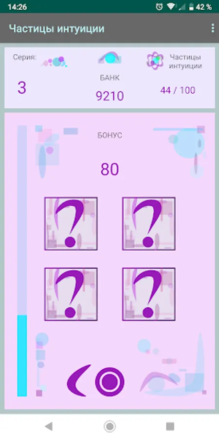 The App "Particles of intuition "is my second app from the cycle "Intuition training". I myself spend 90% of my time in training mode with two possible answers. Other training modes, like the game itself, are designed to add variety. Make the process of training intuition less monotonous.