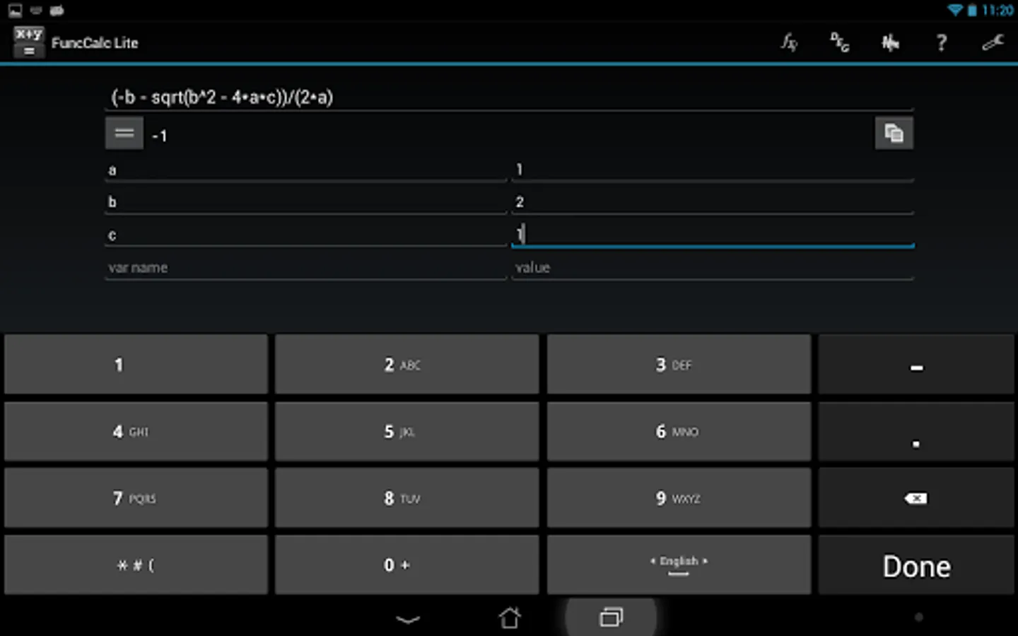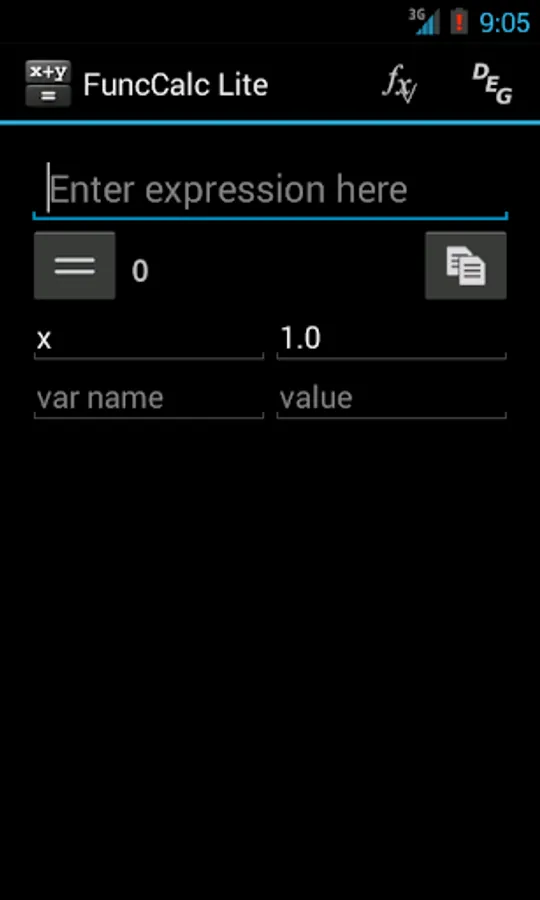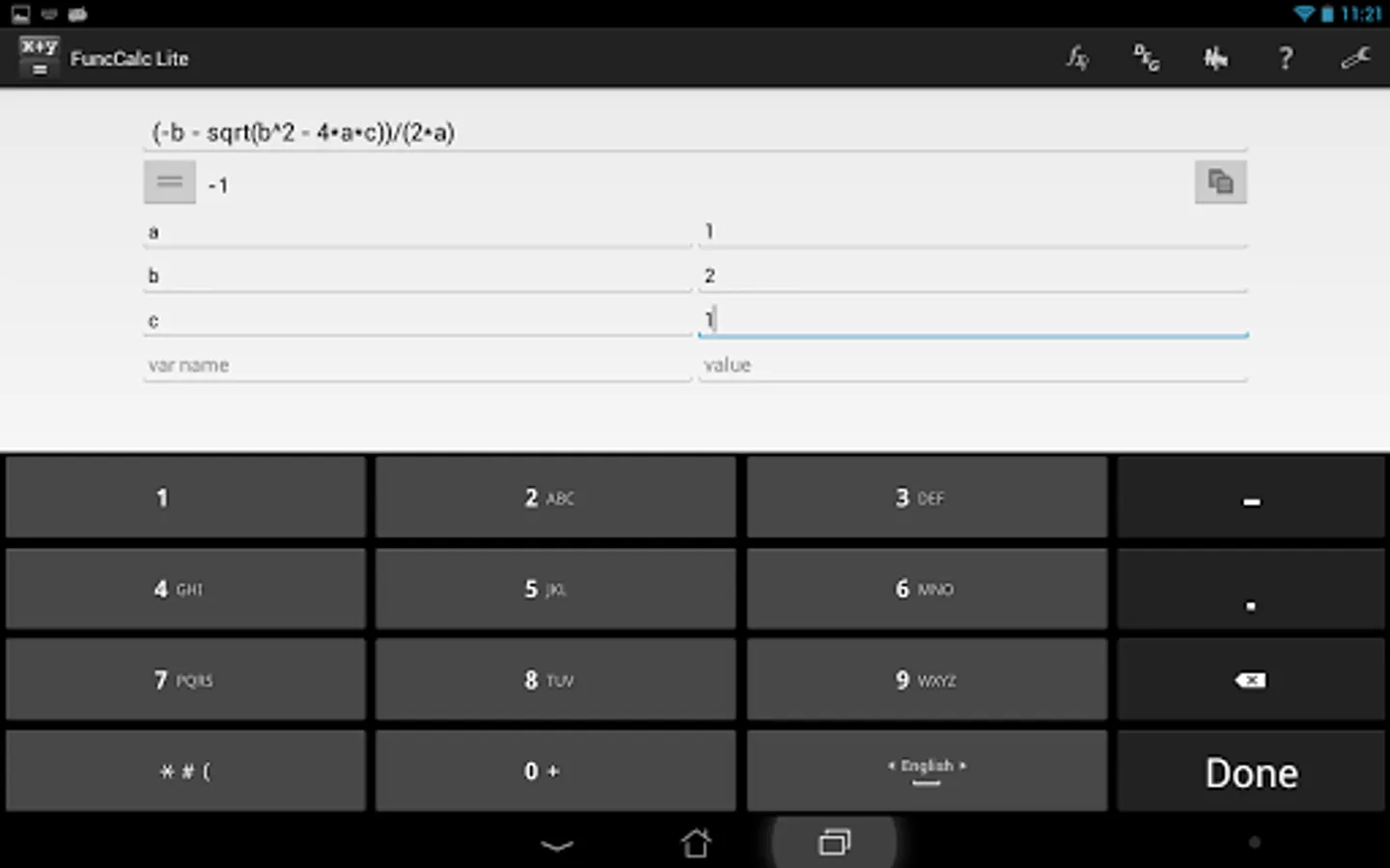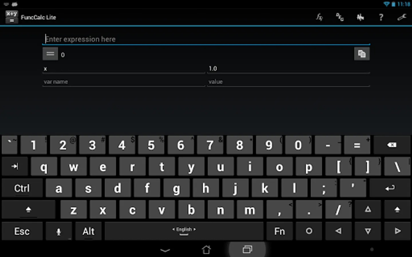 It is a simple, but powerful calculator. The main function of the software is calculation on the given formula. To do this, just type in an expression, variables to be used and press the button ‘=’. Besides, it is possible to draw function graphs, with multitouch supported within this mode. Apart from ordinary operators you may use trigonometric and hyperbolic functions.
