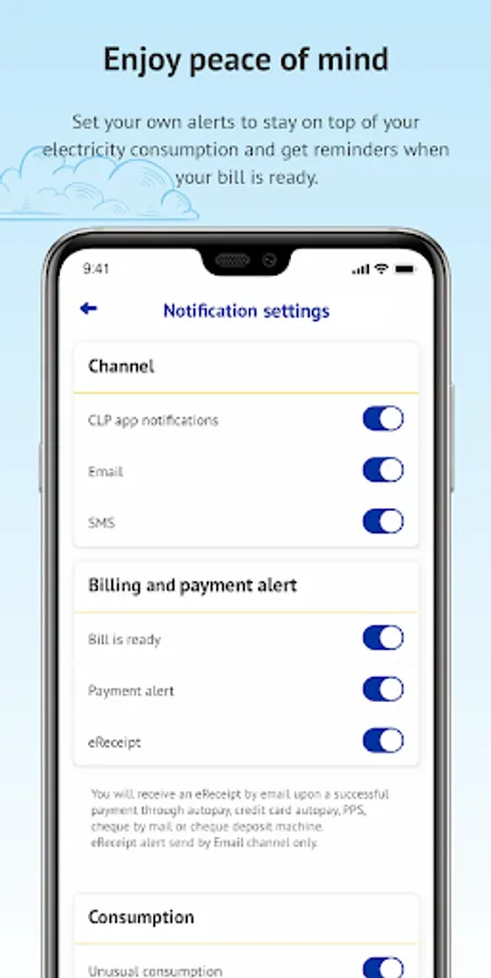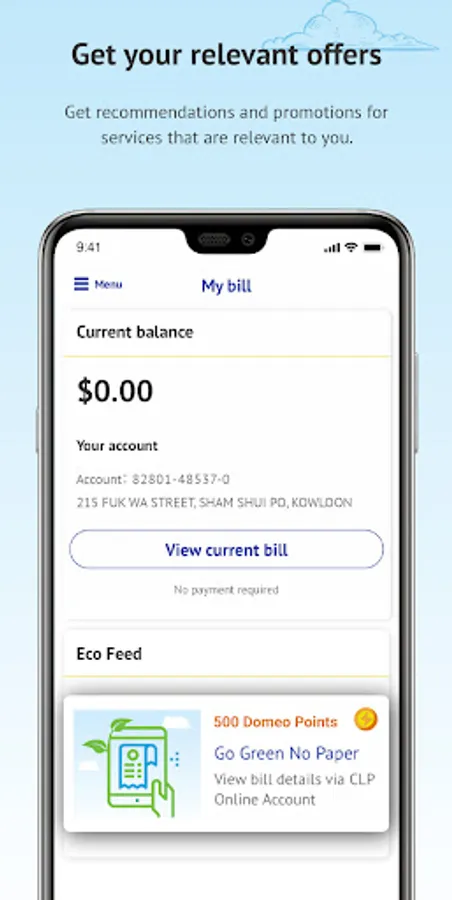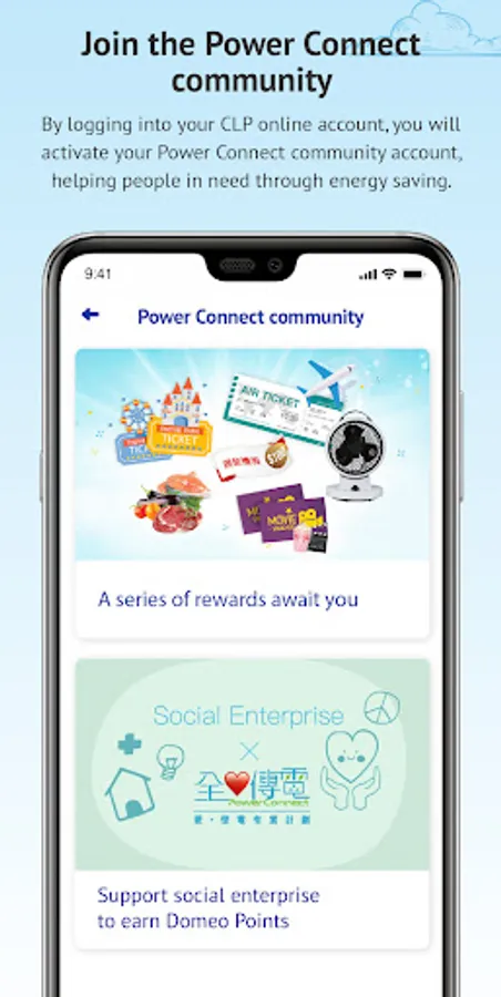 Enjoy a full array of eServices in the CLP mobile app to experience our personalised e-Journey. Just one app allows you to view eBills, make Mobile Payments, join the Power Connect activities, shopping at Domeo eShop, and set up a new electricity account with the Move-in service. You can also earn Eco Points and rewards when you register for each eService. Download the CLP App and enjoy the ease of e-living today!