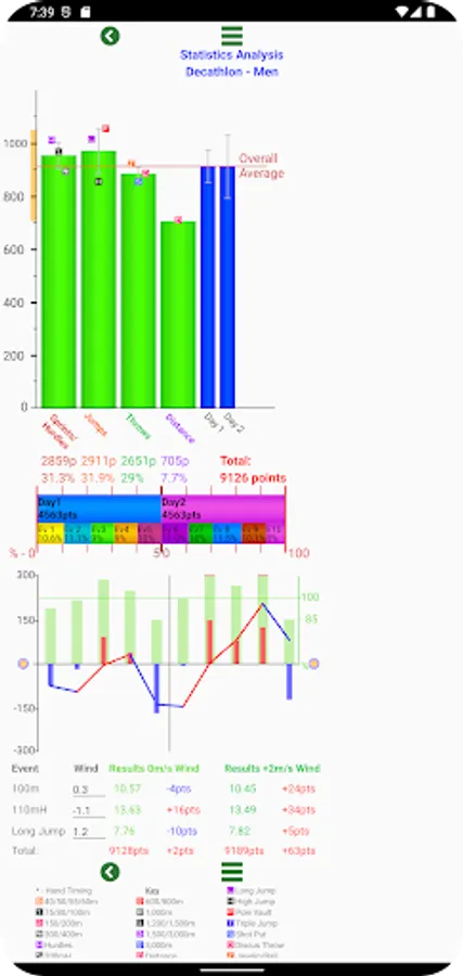 -Highest and lowest event scores highlighted on calculator, stats analysis of all scores.