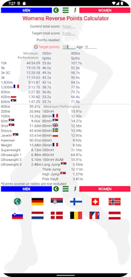 To have other national junior age group events added please send me the country, age group, event order and the scoring formula for events not covered by the World Athletics tables e.g. 75m Hurdles, mens 800m, etc...