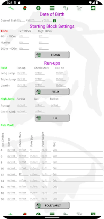 -Save run-ups, block settings, personal bests, season’s bests, combined events bests and training bests for all events, also save bests for various performance tests. Performance test screen includes 1RM calculator.