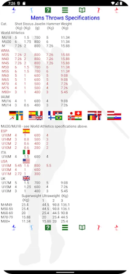 -Hurdles and throwing implement specifications and combined events specific rules available for reference.