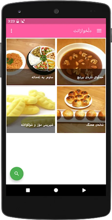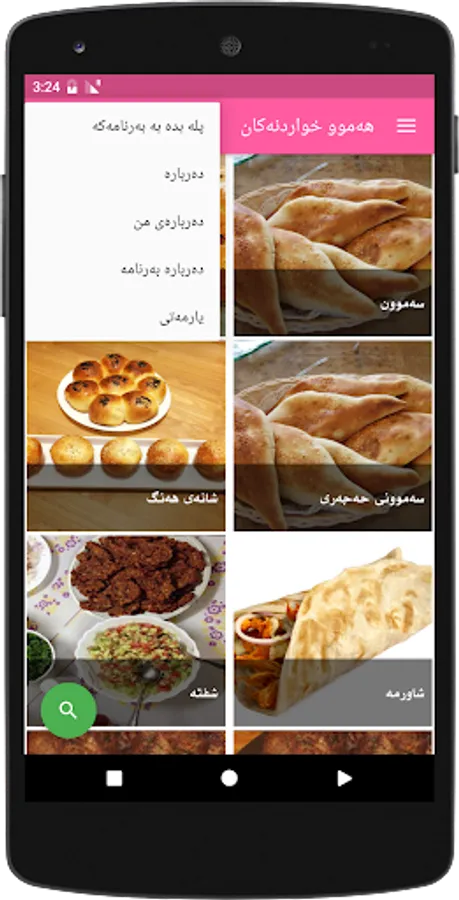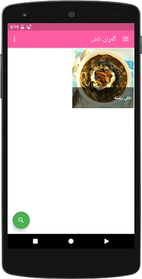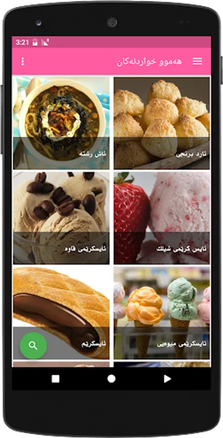 وە دوگمەی گەڕان تۆ دەتوانی لە خواردن بگەڕێی لە ناو بەرنامەكە بە نوسینی ناوی خواردنەكە بە پیتی كوردی تا ئاسانتر بیدۆزیتەوە.