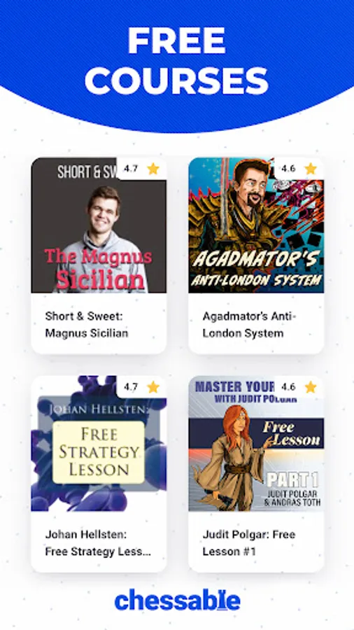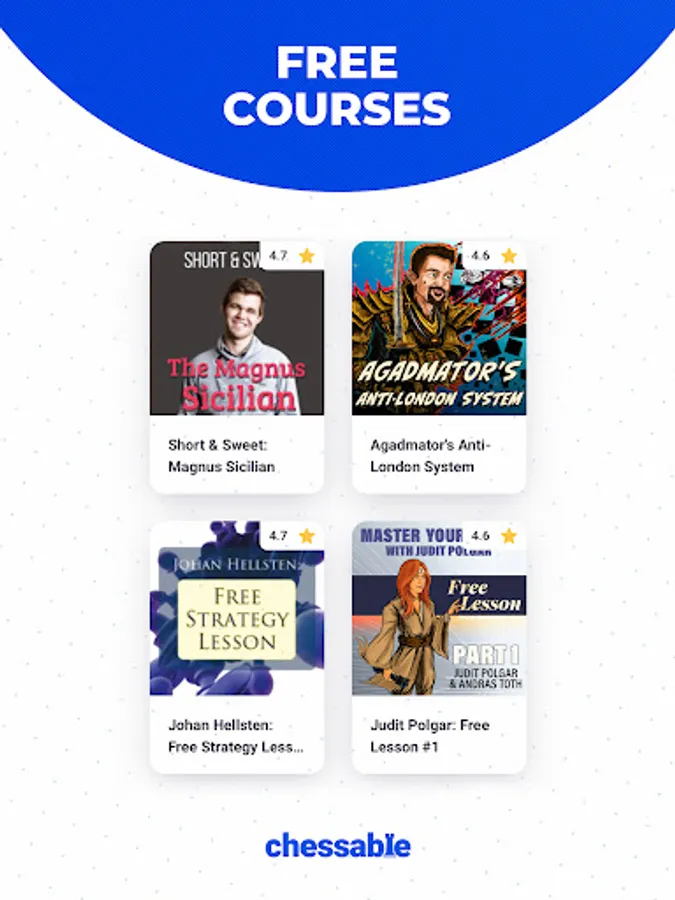 Chessable is the best place to learn chess online from the world’s top players. Brought to you by world champion GM Magnus Carlsen, Chessable’s MoveTrainer technology prompts you to learn different moves, and then finds the optimal time for you to review them so you remember every detail. Enjoy free courses on openings, the middle game, endgame, tactics and strategy to improve your chess skills with hundreds of free lessons.