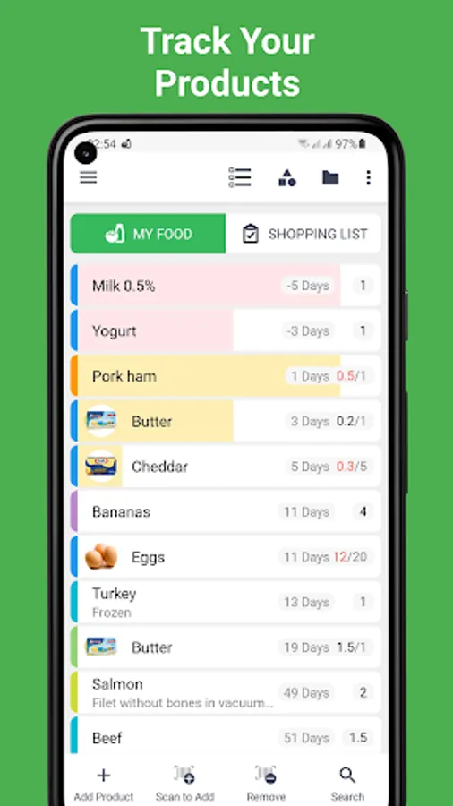 - You can see expiration date of each product in the list as well as a visual indication of products expired soon or already expired