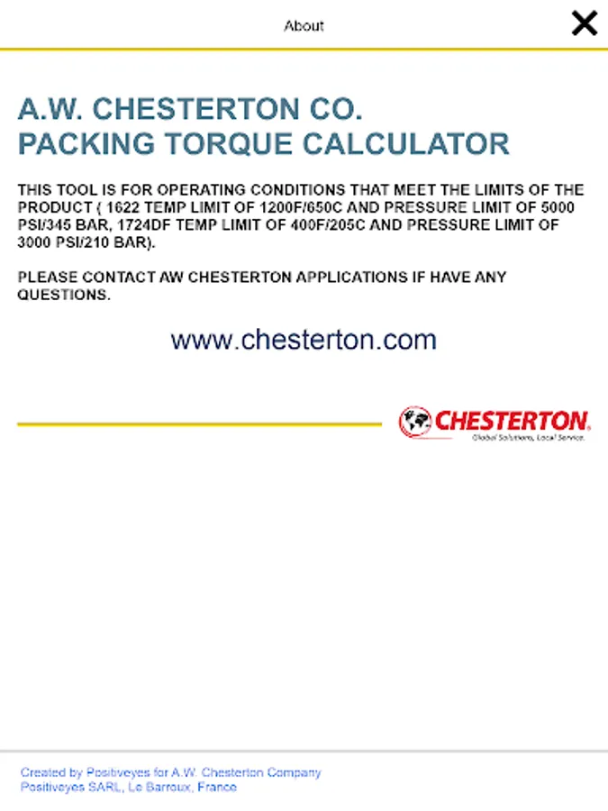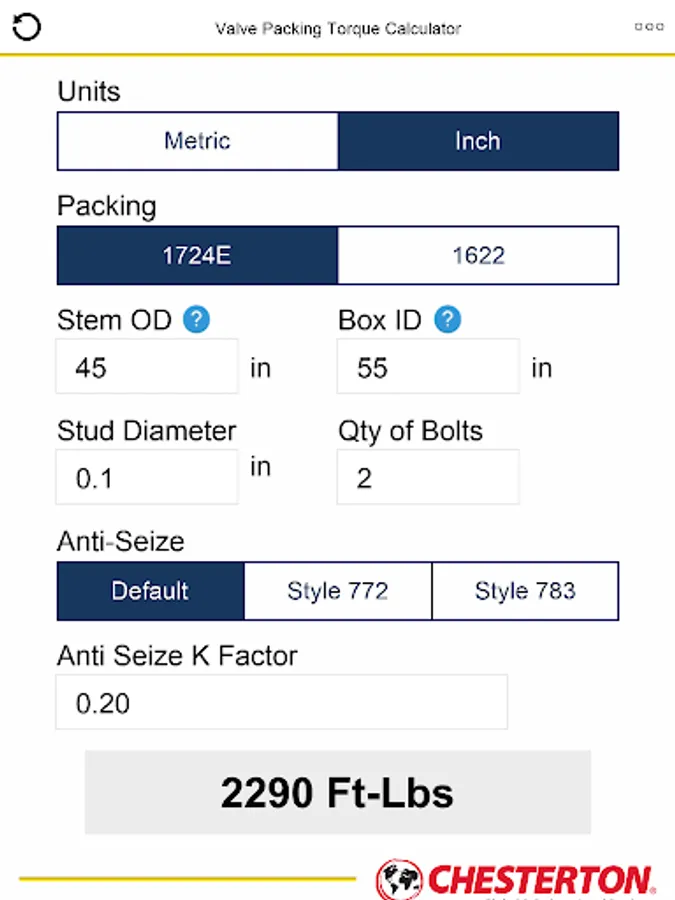 This tool calculates the gland bolt torque for valves that are packed with Chesterton style 1622 Low Emission Packing or Chesterton style 1724E Low Emission Sealing Sets. It requires the entry of the stuffing box inner and outer diameter, the stud diameter and number of studs and the entry of the lubricant used when tightening the valve. The tool works both in Inch and Metric units.