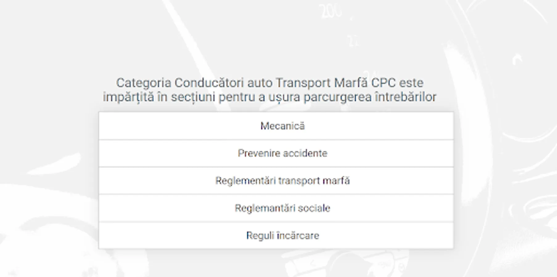 Exam simulation and learning environment for the subcategories: Mechanics, Accident prevention, Freight transport regulations, Social regulations, Loading rules