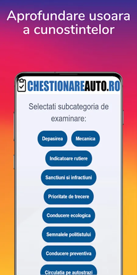 2. DRPCIV car quizzes divided by topics of interest: mechanics, first aid measures, overtaking, priority, etc.. so that you can deepen the questions you have the biggest problems with. Just like the category tests, at the end of each questionnaire of this kind you will find detailed explanations so that the wrong questions will be easy to answer when you meet them in the official DRPCIV exam.