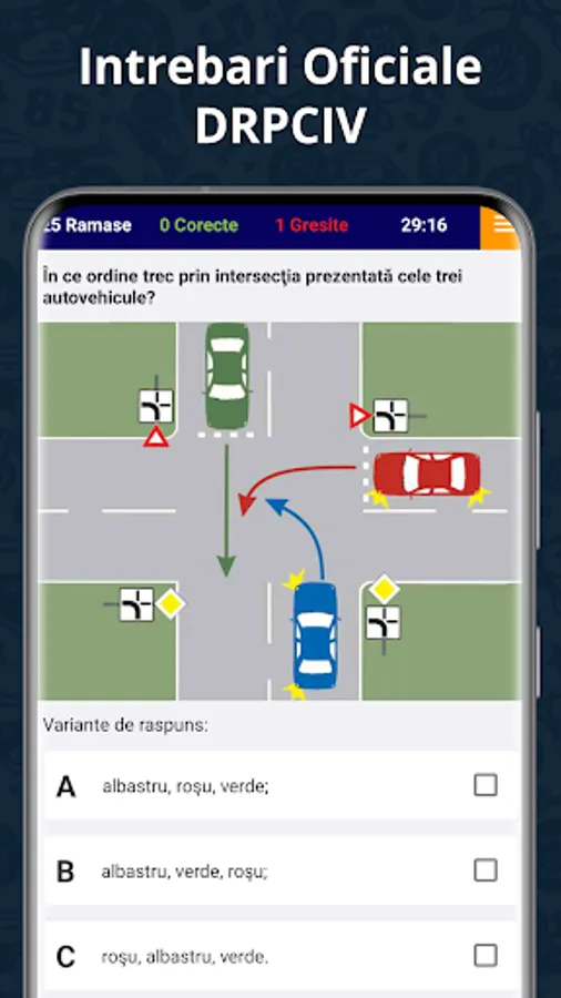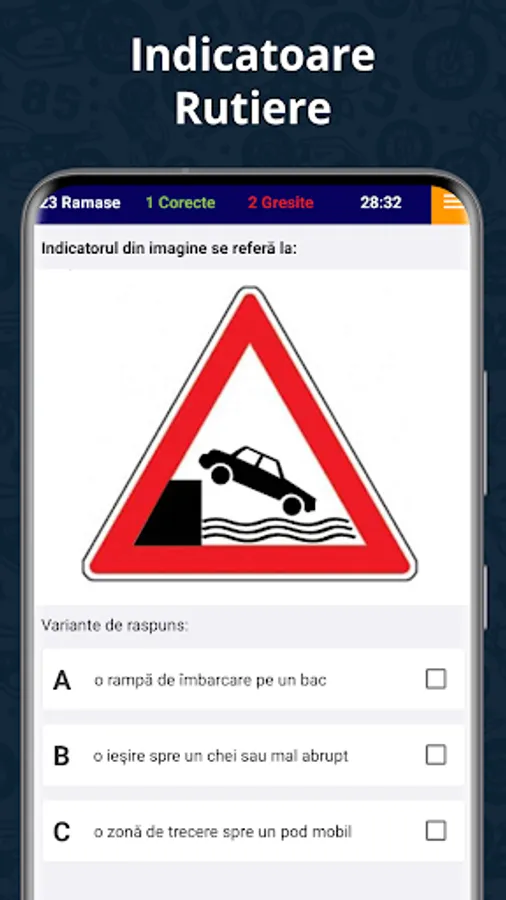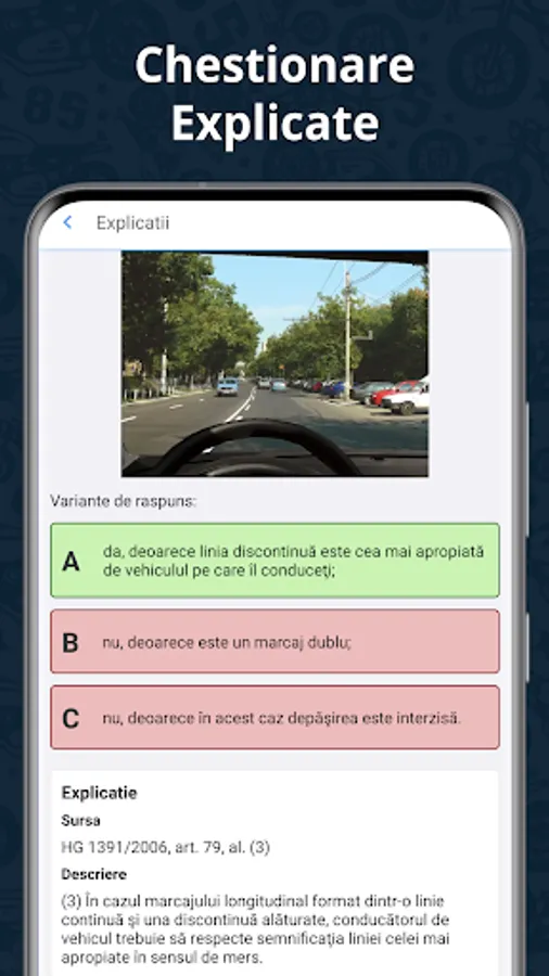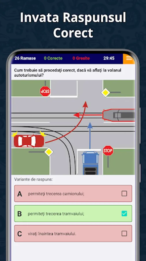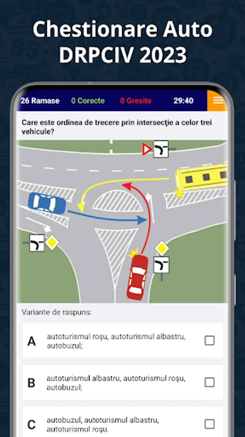 Learn with the help of our 2023 driving test application how to pass the theoretical exam at the driving school. In this application you will find all the necessary resources to successfully pass the driving test. We created this car quiz application to be exactly the same as the one in the gym. The questions from the car tests are the official DRPCIV ones.