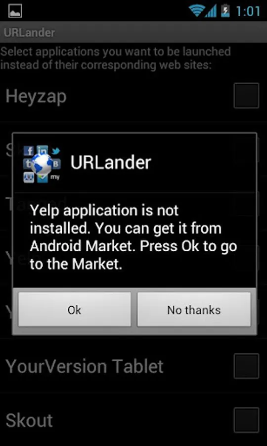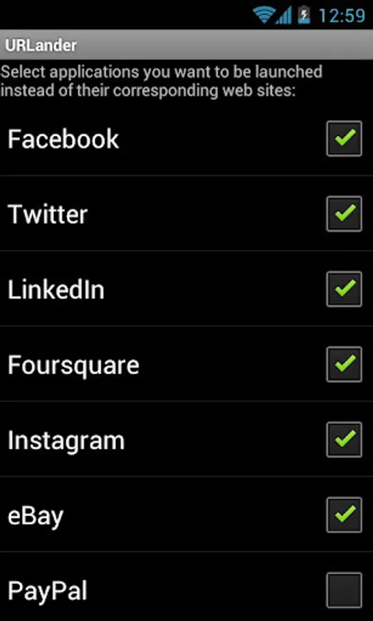 Say, when you click on www.facebook.com link, URLander allows you to open it in browser or launch Facebook app instead. The same with Twitter, LinkedIn, Foursquare, eBay, PayPal, Myspace, Tumblr, and other popular web services! Please, send me email if your favorite social network is not on the list. I will add it in future version.