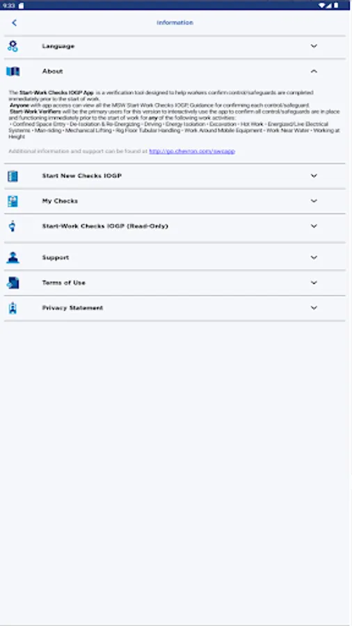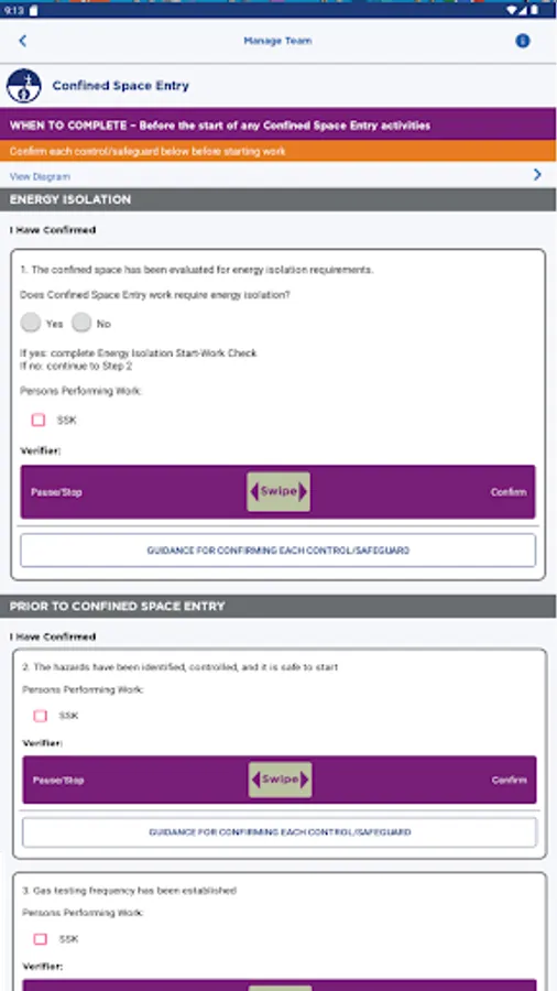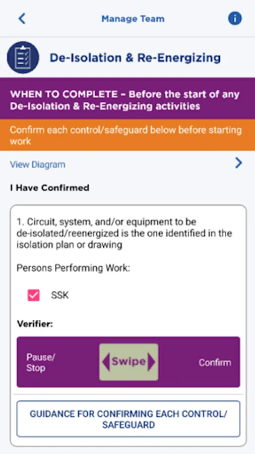 Start-Work Verifiers will be the primary users for this version to interactively use the app to confirm all control/safeguards are in place and functioning immediately prior to the start of work for any of the following work activities: