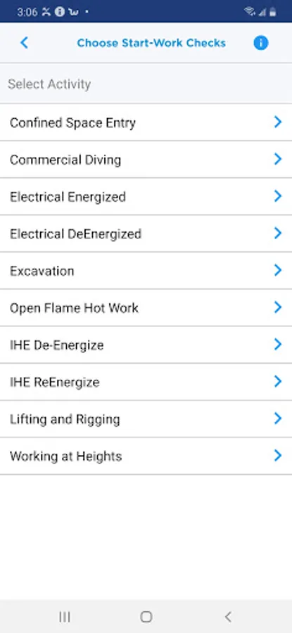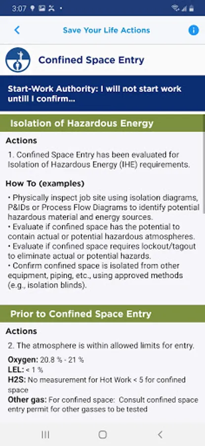 The Chevron Start Work Checks App is a mobile verification tool designed to help field workers confirm appropriate safeguards are in place and “Save Your Life Actions” are completed immediately prior to the start of high work activities. The app supports overall efforts to eliminate serious injuries and prevent work site fatalities.