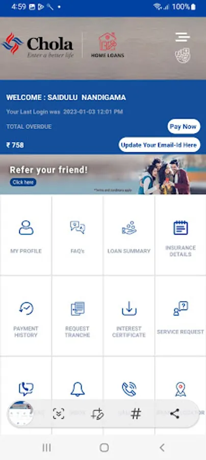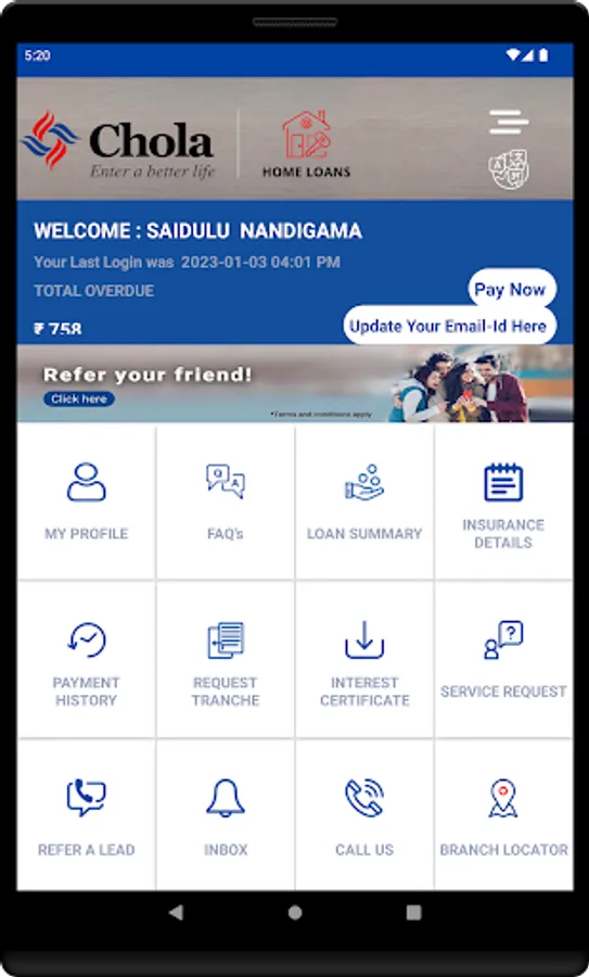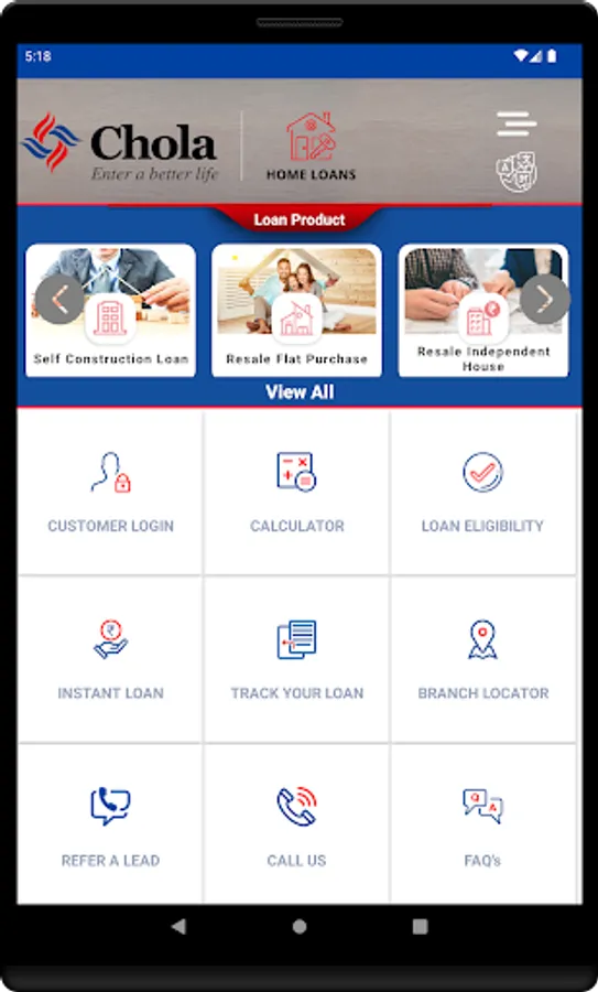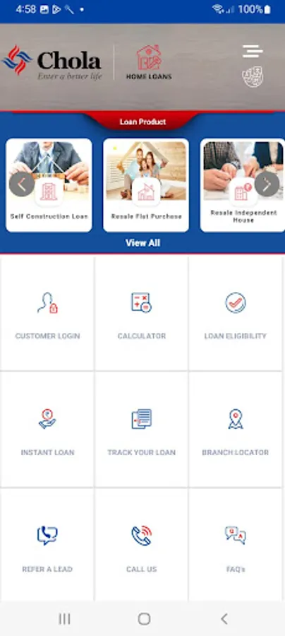Chola offers doorstep services ensuring easy and fast approval and disbursal of loans. Loans for self-construction, home extension, purchase of ready property (new/resale) and transfer of existing loan are on offer. Through this app one can calculate the EMI, apply for a loan, track the status of the application and upon disbursement be served at the click of a button. One can also refer leads for Home Loans.