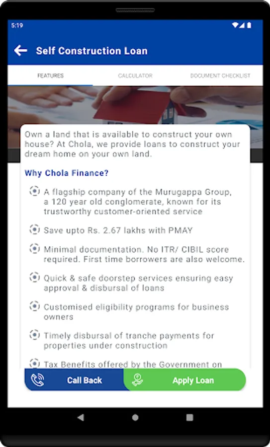Home Loans is yet another offering from the flagship company of the Murugappa Group, a 120 year old conglomerate, known for its trustworthy customer-oriented service. Chola is committed towards the National Mission of Housing for All by 2022 and actively helps customers receive the PMAY subsidy upto Rs. 2.67 Lakhs. The documentation required is also minimal. (Income proof or existing CIBIL score is not a mandatory requirement). More info is available on the app.