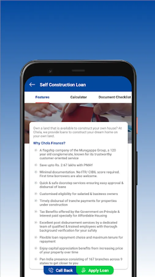 Home Loans is yet another offering from the flagship company of the Murugappa Group, a 120 year old conglomerate, known for its trustworthy customer-oriented service. Chola is committed towards the National Mission of Housing for All by 2022 and actively helps customers receive the PMAY subsidy upto Rs. 2.67 Lakhs. The documentation required is also minimal. (Income proof or existing CIBIL score is not a mandatory requirement). More info is available on the app.