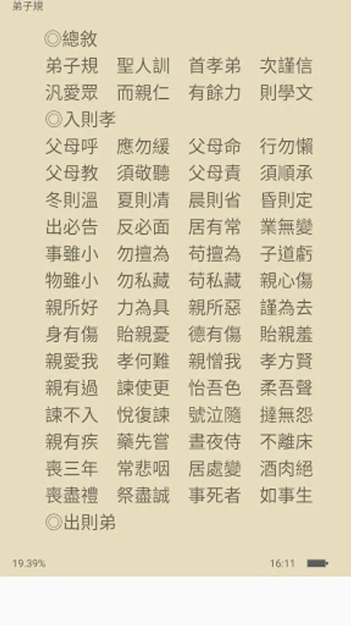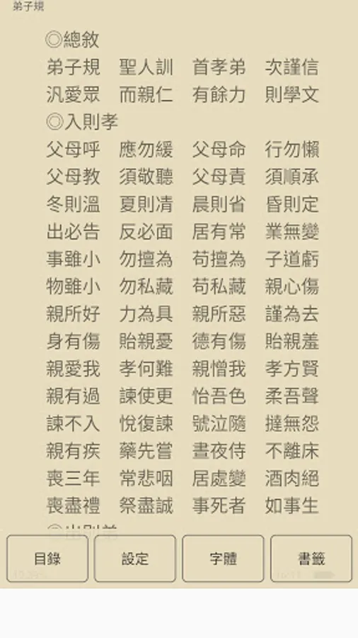 "Disciple Guidance", formerly known as "Xunmeng Wen", is a literary work that appeared in the Qing Dynasty, written in rhyme. It starts with the moral education, which is the first of the four Confucian teachings, and elaborates in detail the life style and learning methods that the learners should follow, that is, firstly focus on the fundamentals of morality, and then seek to enrich the knowledge, as the basis for promoting the cause of benevolence and virtue. It is generally believed that the author is Li Yuxiu, a talented scholar in the Kangxi period of the Manchu and Qing Dynasties. It was later revised and adapted by Jia Cunren and renamed as "The Rules of Disciples".
