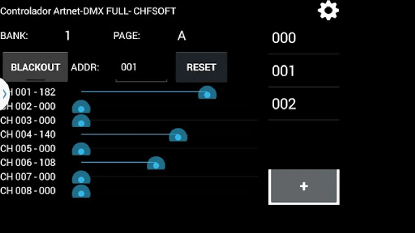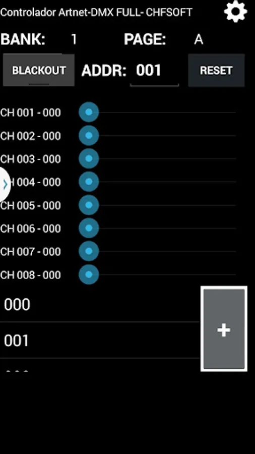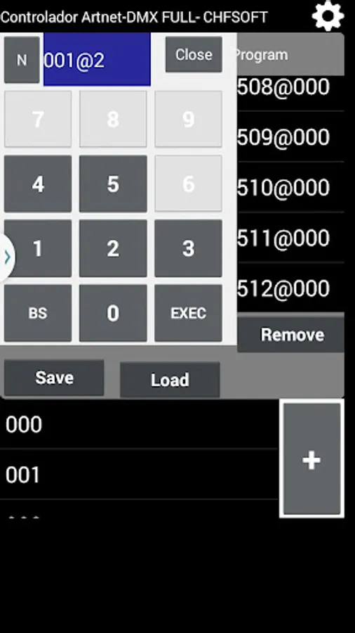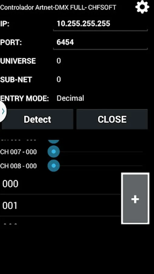 - Range mode: e.g.: 001-008@255 (Sets DMX channels 001 through 008 values to 255);