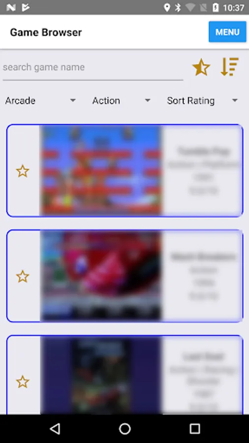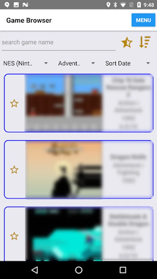 It supports game search, provides convenient sorting and filtering based on game systems/rating/genre, shows detailed game info such as screenshots, description and handy google search results. You can link local roms to a game and play right inside the app. You can also bookmark your favorite games so you will never lose track of what to play next.