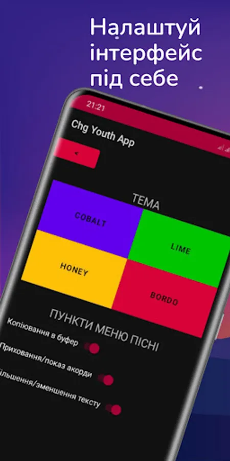The application implements 4 color themes that work in day/night mode, according to the system settings.