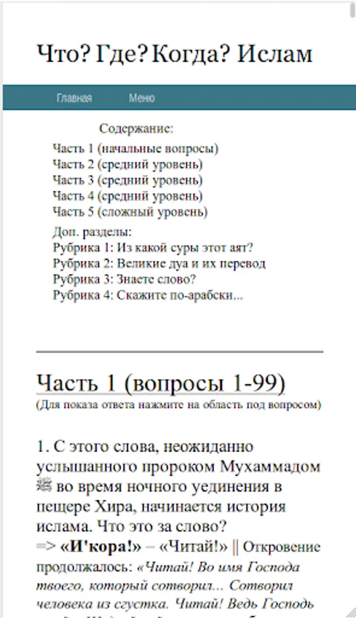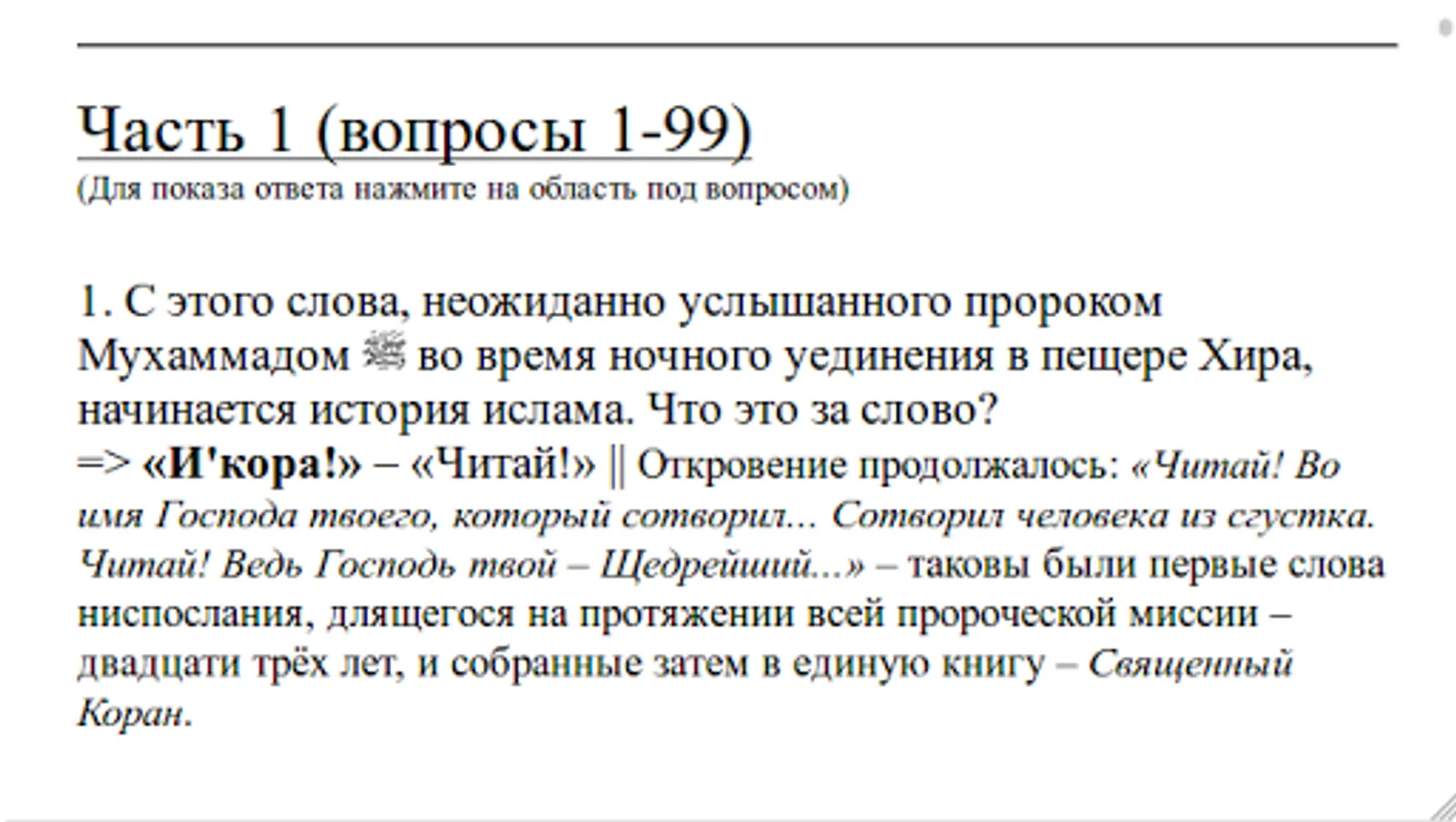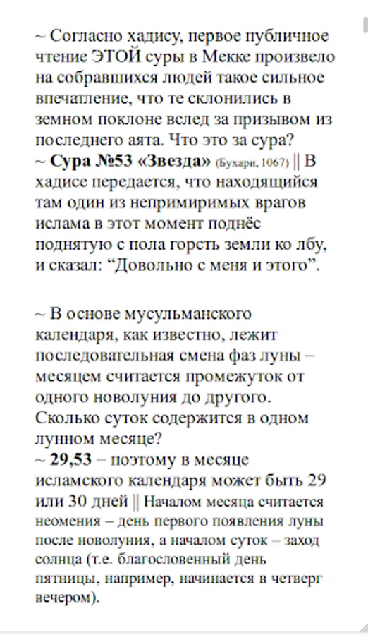 Collection of cognitive questions about Islam (300+ questions). Test your knowledge and learn new things! Questions in categories: Quran, Hadith, Iman, Ibadat, History, Arabic.