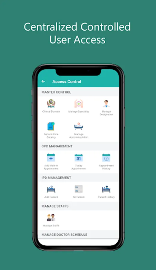 1) Role Based Distributed And Centralized Control:Departments of your business like Doctor, Receptionist, Nurse etc. has own rights controlled by business super administrator.