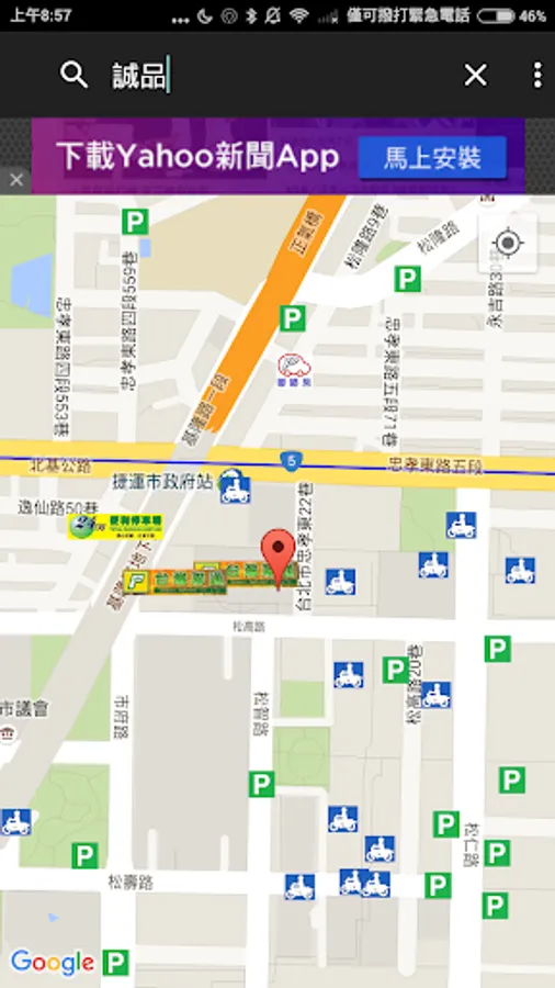 選好停車場後,螢幕右下角會出現兩個圖標,左邊那個是右轉的圖案,右邊的是Google Map的圖案,請點左邊那個右轉的圖標,就會連結到Google Map 的導航功能。