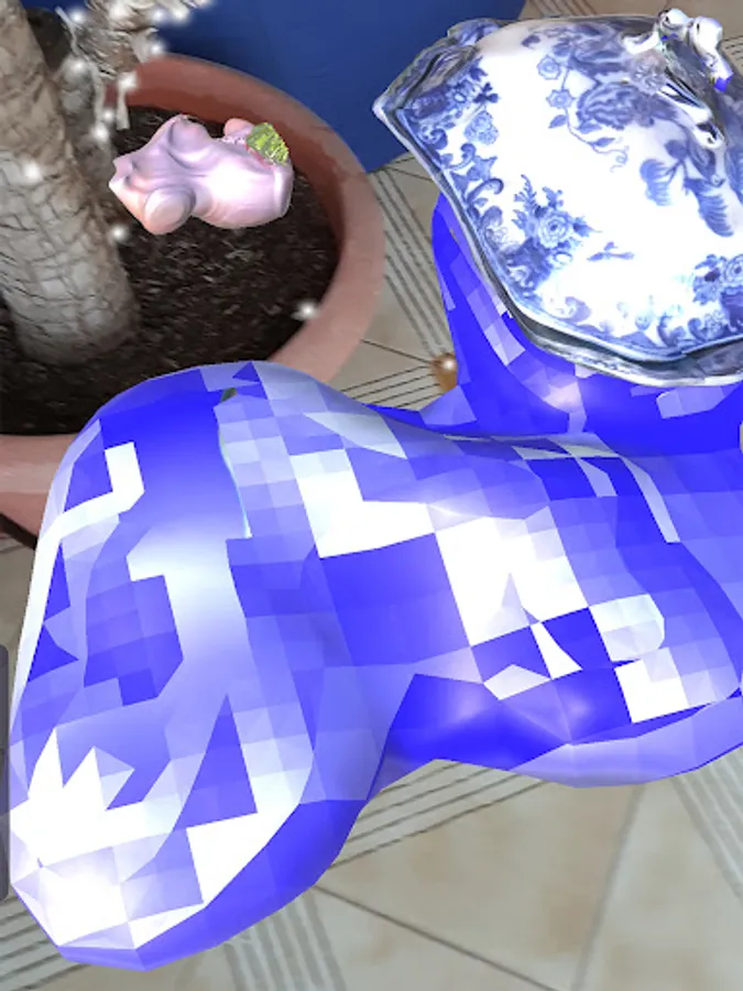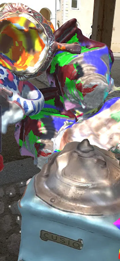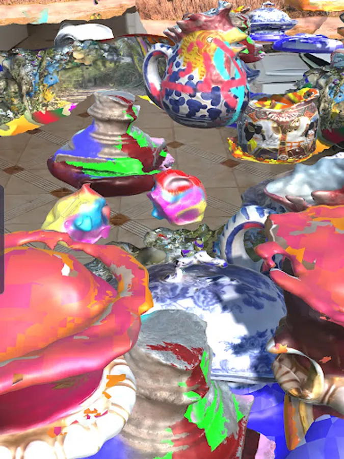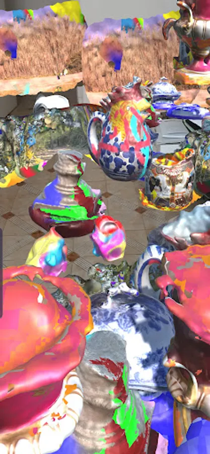 Infect, the AR artwork speculates on landscapes, paintings, and objects by letting the audience recreating a ‘diffuse’ augmented reality object-oriented space formed by diverse random objects. Through photogrammetry technique, Still Life overlays objects and landscapes to generate a saturated panorama, challenging physical places to render it vibrant and participatory. Through custom game play using fingers, users discover and interact (rotating, translating, scaling) with 33 domestic items, such as digitised kettles, vases and sugar canisters, etc.