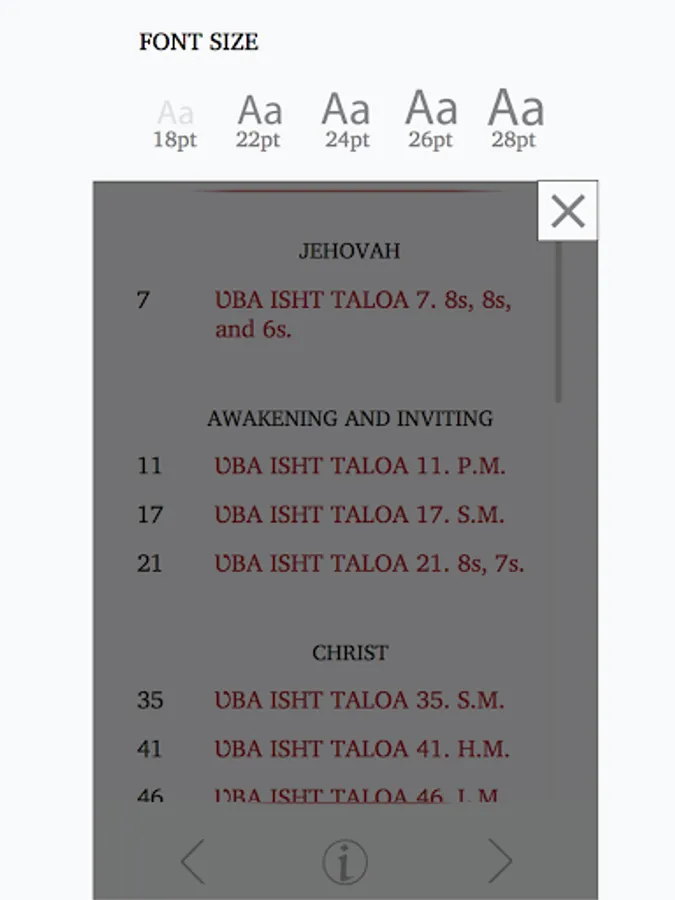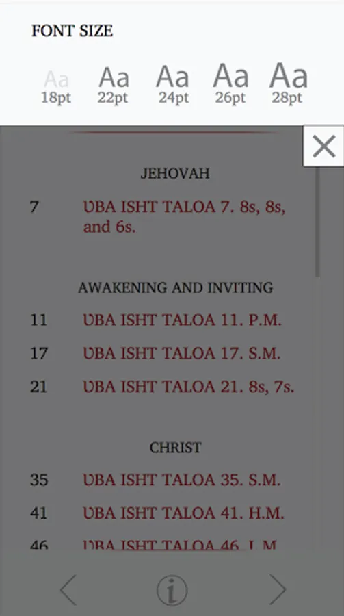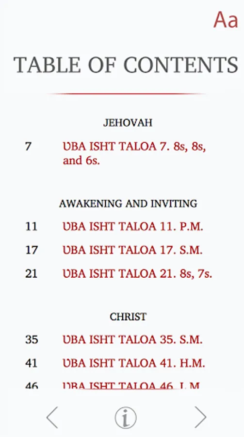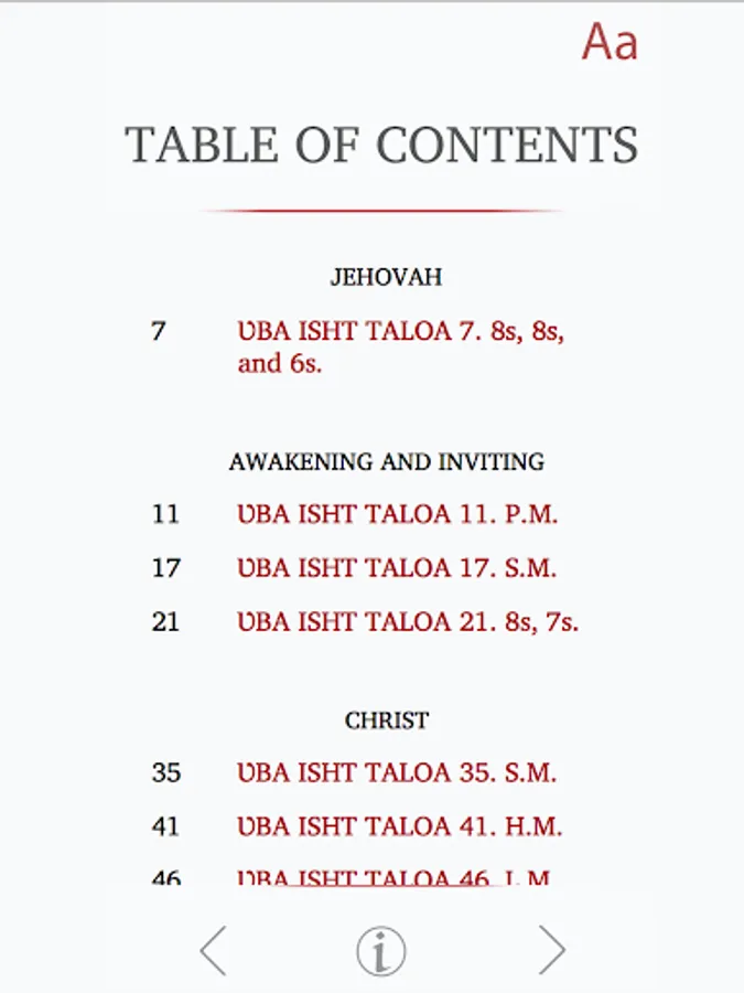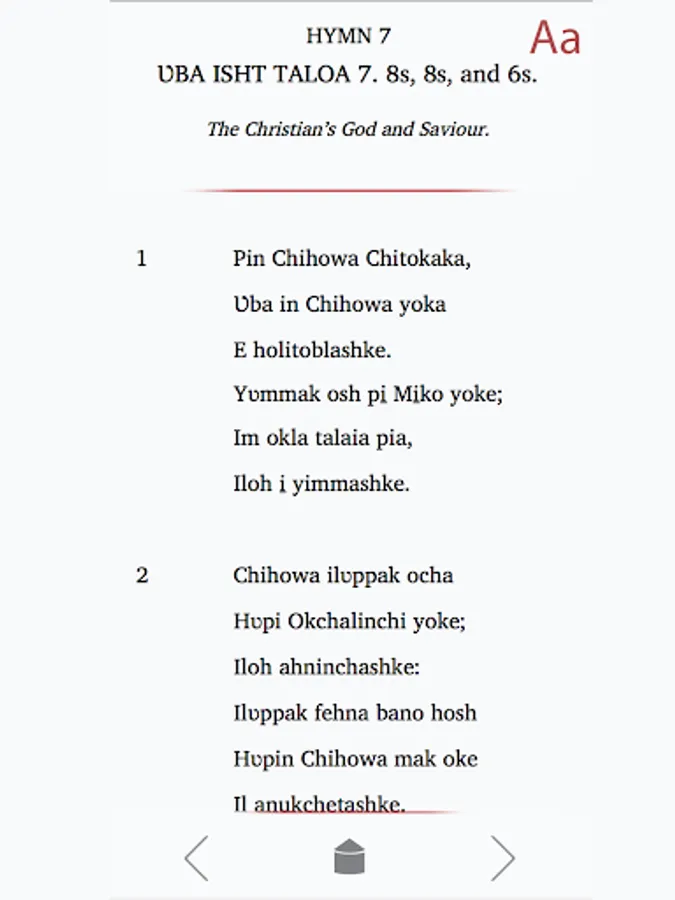 The Choctaw Hymns App offers a selection of popular Choctaw hymns from the print version of the Choctaw Hymn Book. It features adjustable font sizes and an easy-to-navigate table of contents menu.