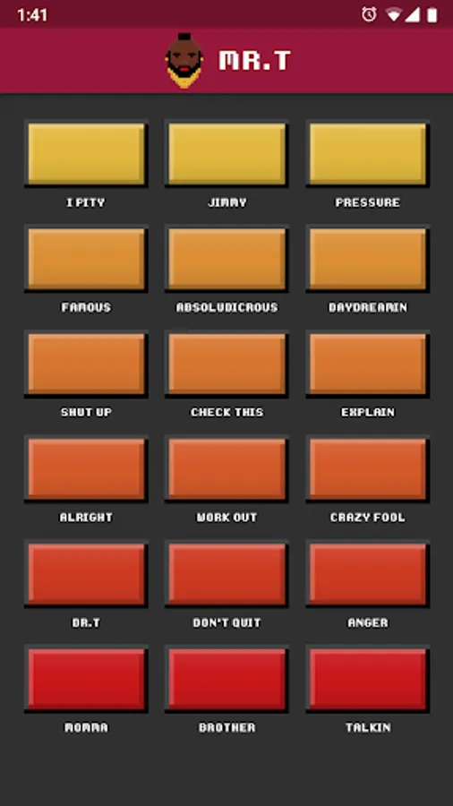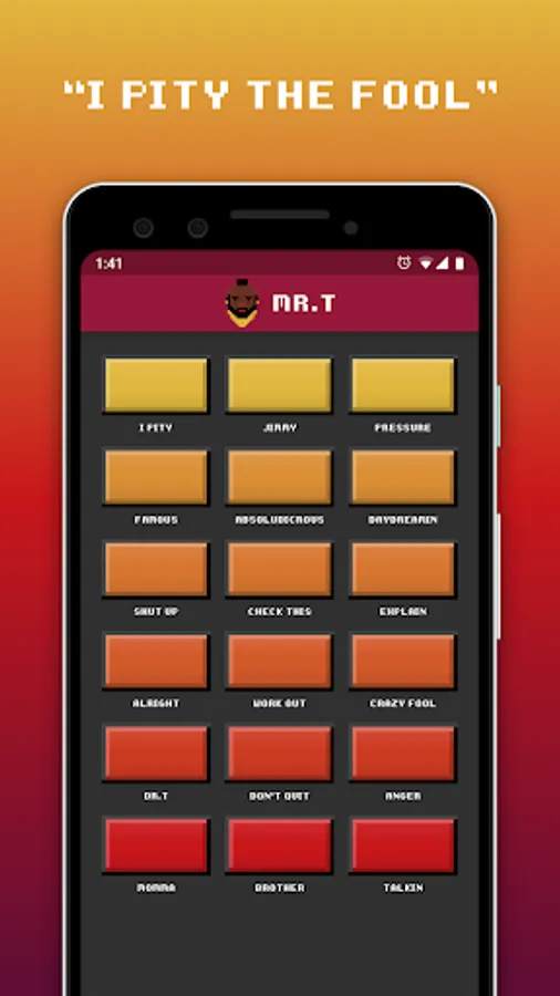 The Mr. T soundboard is here! Travel back to a simpler time with threats, anger, and inspiring quotes from one of the greatest personalities of the 1980's. Put the sounds of Mr. T in your pocket where it belongs.