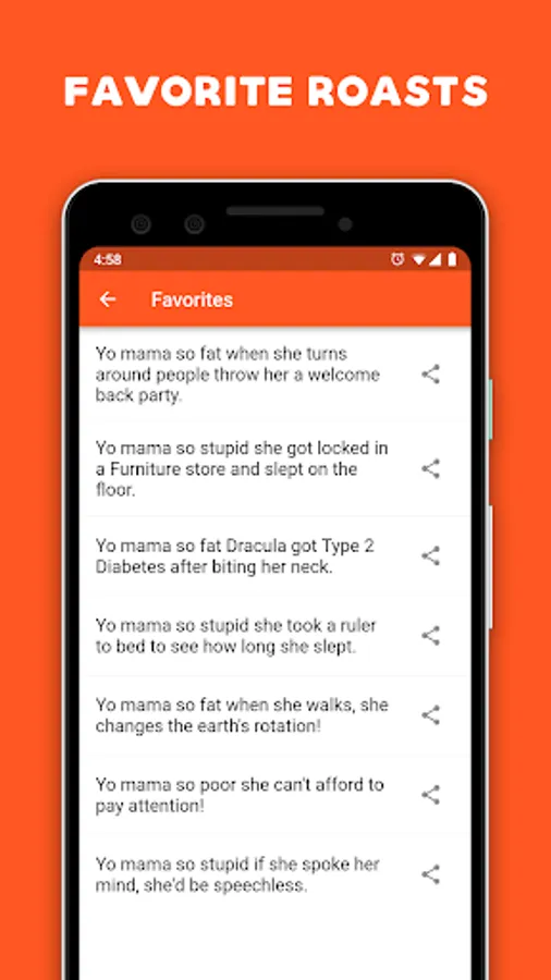 Save your favorite jokes for quick access or share jokes directly via WhatsApp, Facebook Messenger, text message and more!