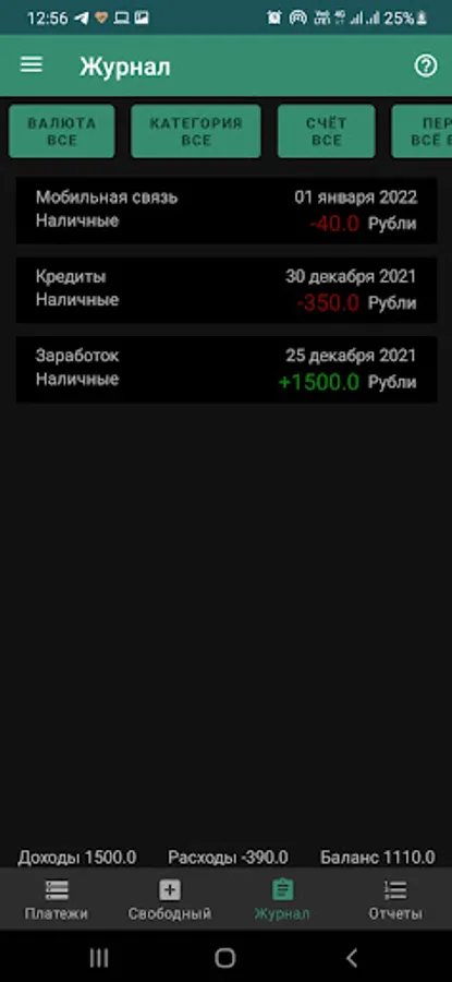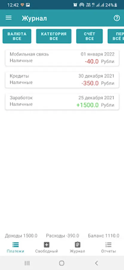 - convenient journal with the ability to filter by categories, currencies and accounts