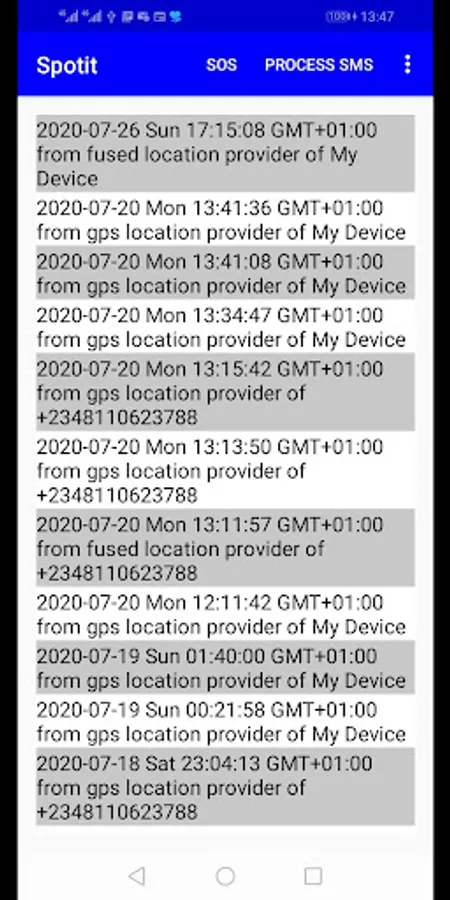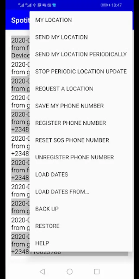 Spotit sends location information solely through SMS. ‘Consequently, the app can be used when your device is not connected to the internet. However, an internet connection is required to view the obtained location information on maps. All received location information, including all your logged location information, can be saved in a database in your device; thus any of them can be viewed anytime. Upon installation of the app, it pays to immediately register the phone numbers of your loved ones. You should also select an SOS number from the registered phone numbers: an appropriate SOS phone number is important as it will be handy during emergency situations.